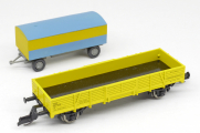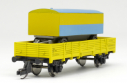 | nízkostěnný vůz žlutý s nákladem maringotky |