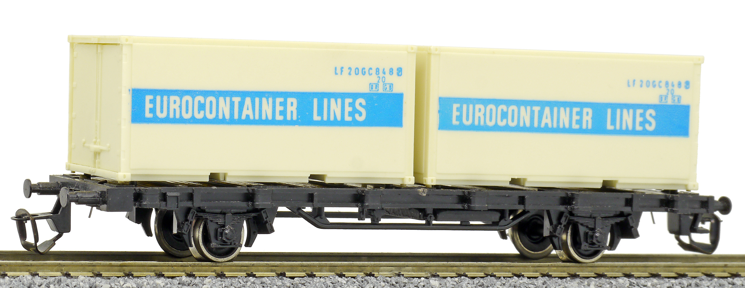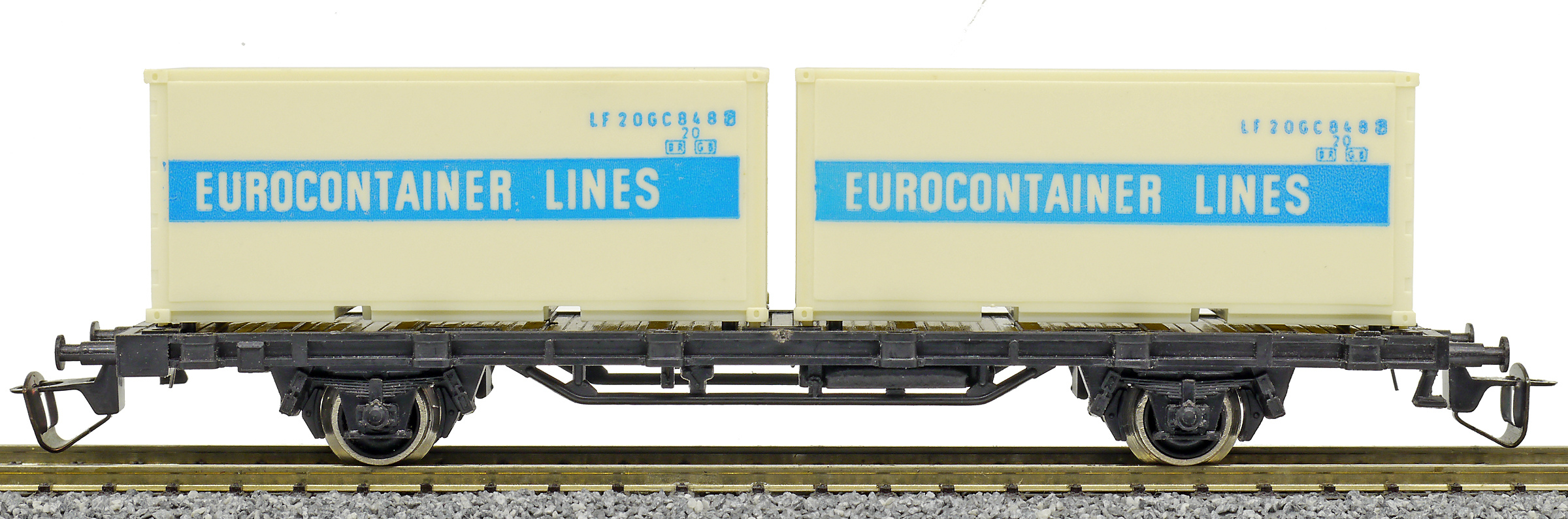 | nákladní plošinový vůz černý se dvěma 20' kontejnery „EUROCONTAINER LINES“ |