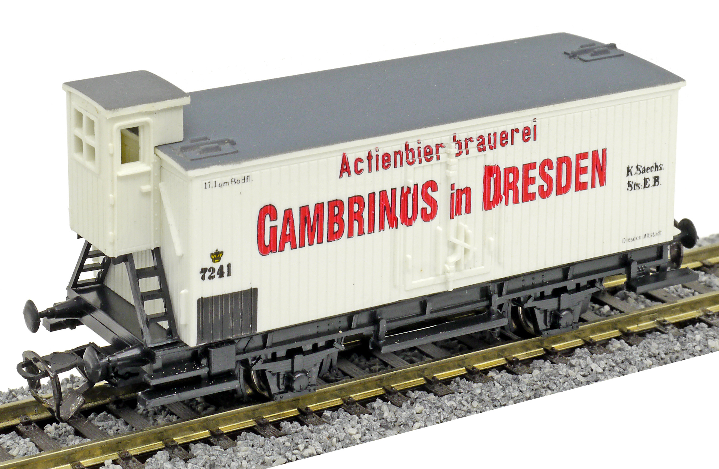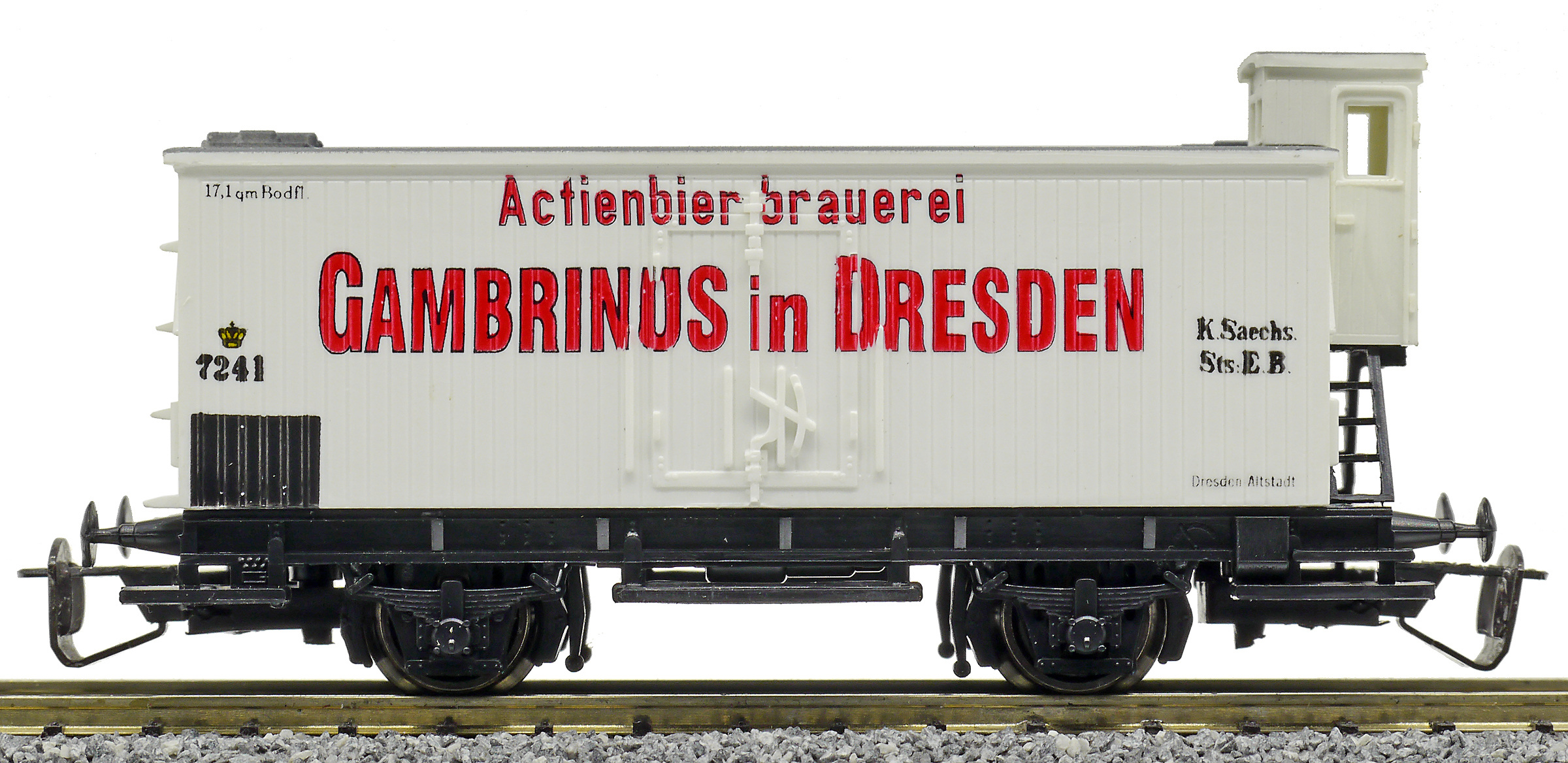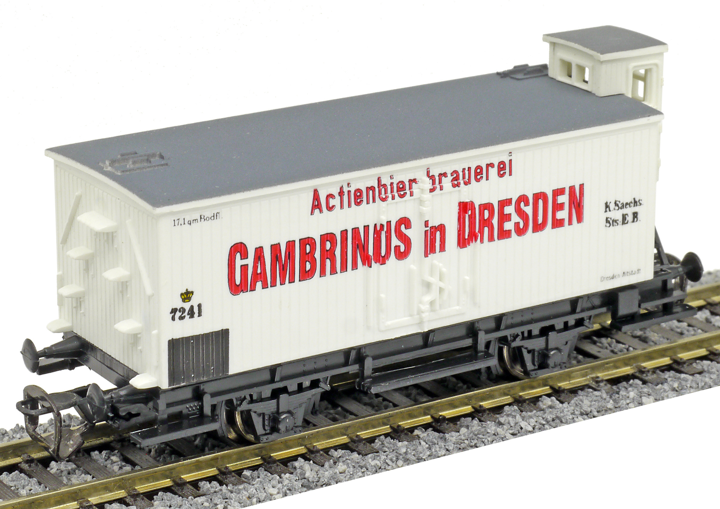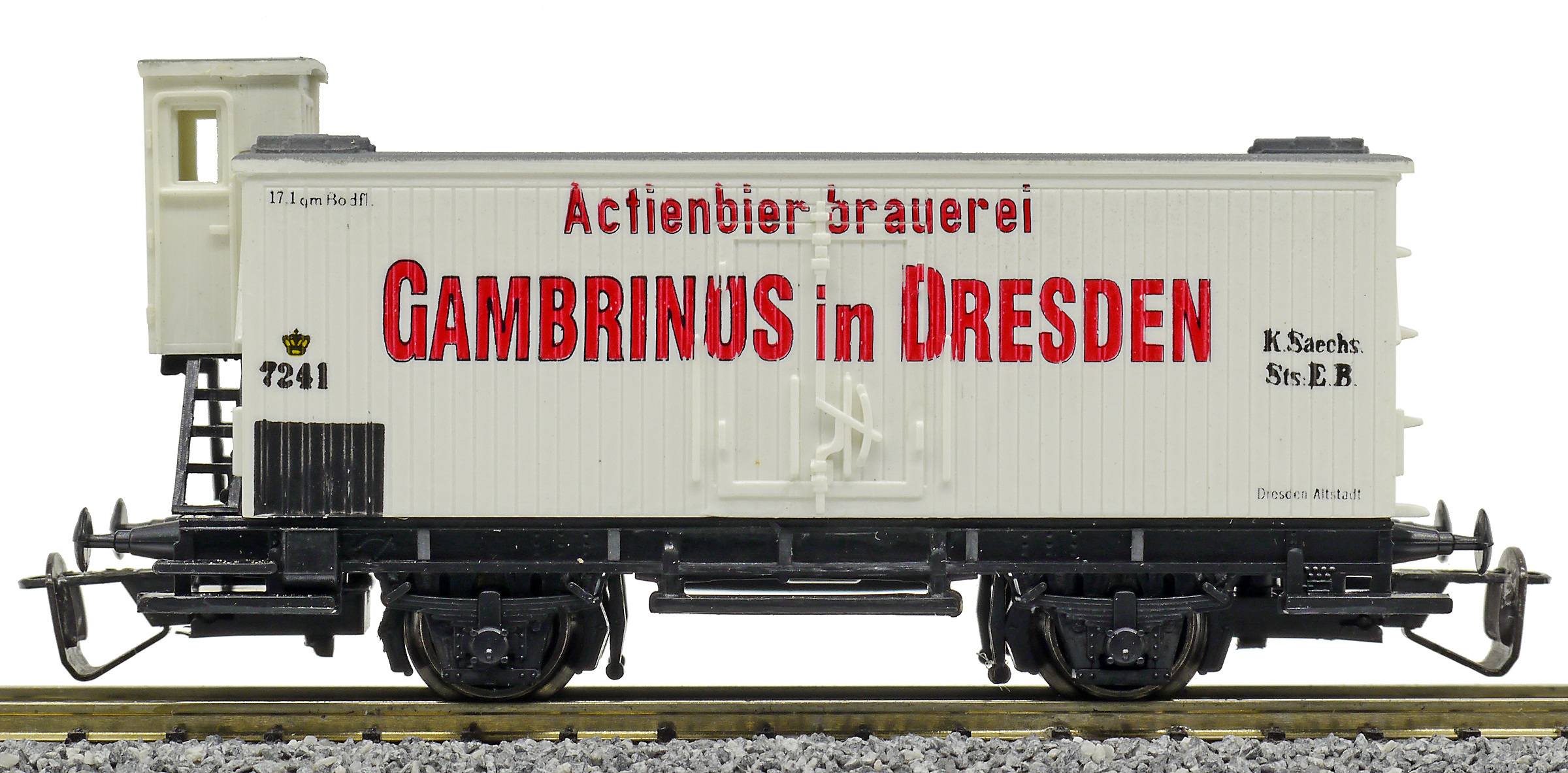 | nákladní chladící vůz bílý s šedou střechou a brzdařskou budkou „Gambrinus“ |