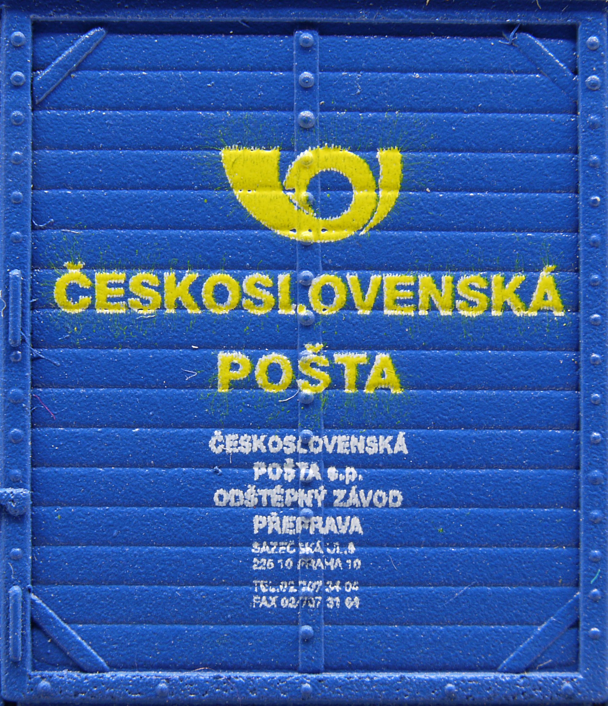 | krytý nákladní vůz modrý s šedou střechou „Československá pošta - Praha” |