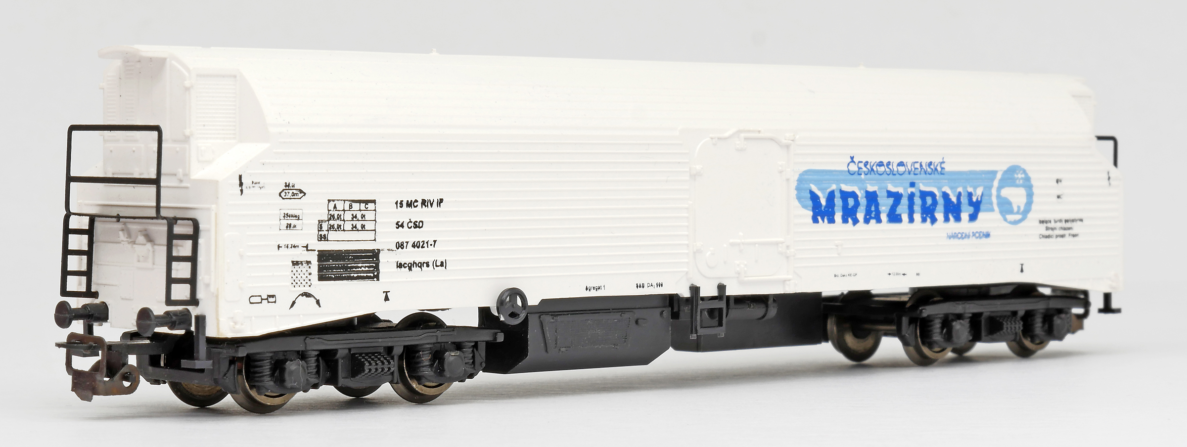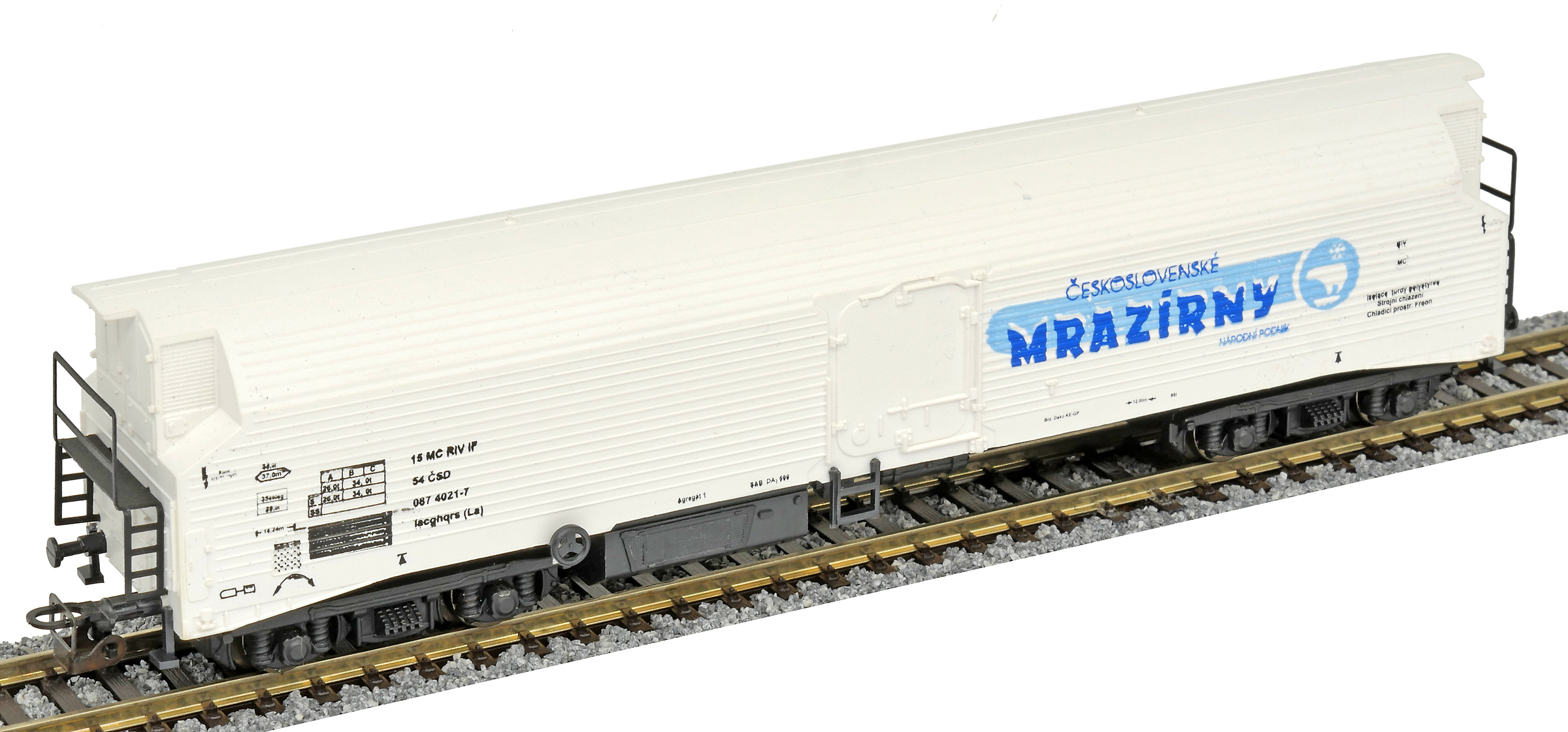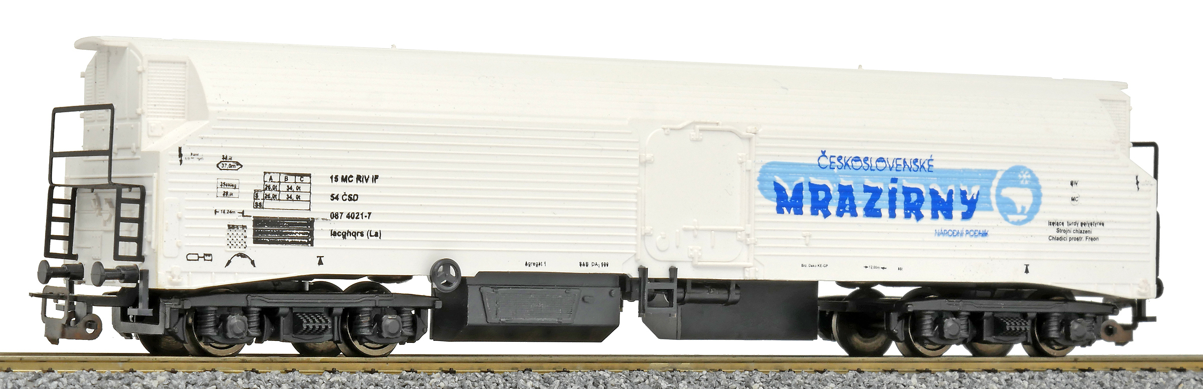 | nákladní chladící vůz bílý s černým pojezdem „Československé mrazírny“ |