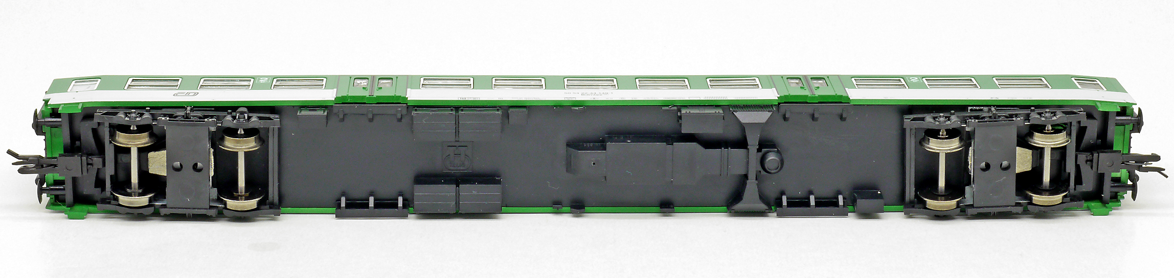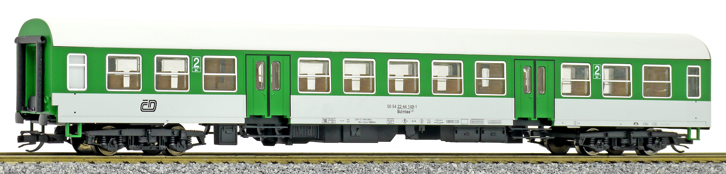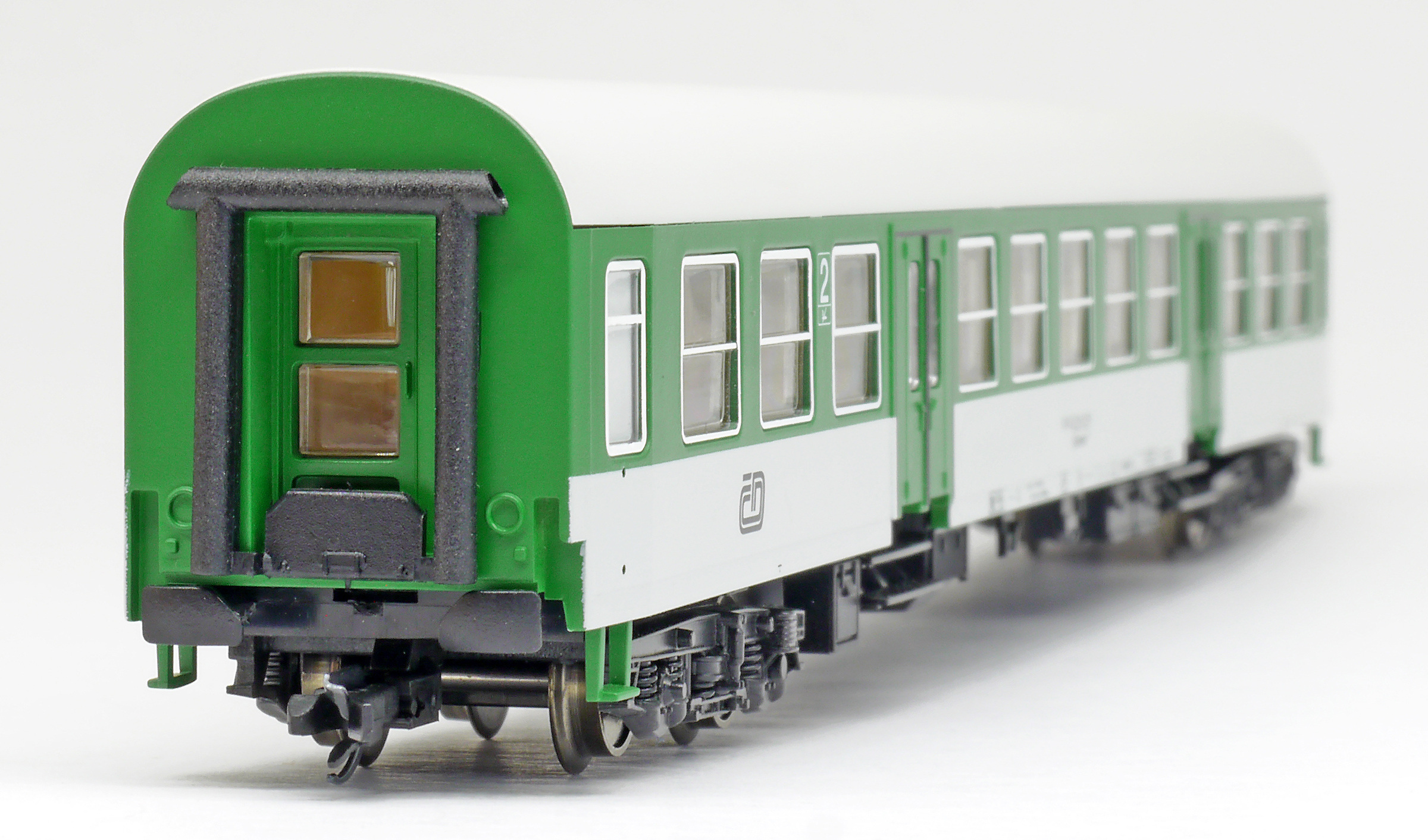 | rychlíkový vůz zelený-bílý se světle šedou střechou 2. tř. |
