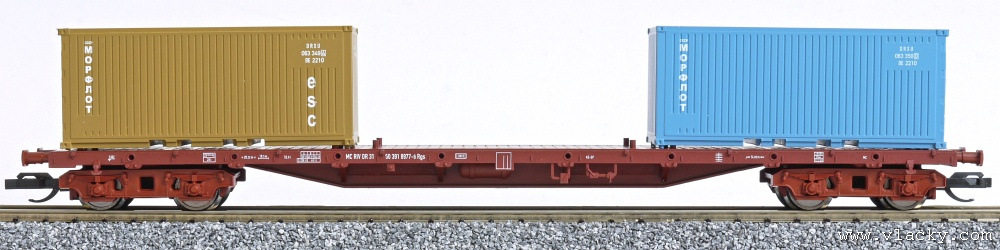 | nákladní plošinový vůz červenohnědý s nákladem dvou kontejnerů 20' |