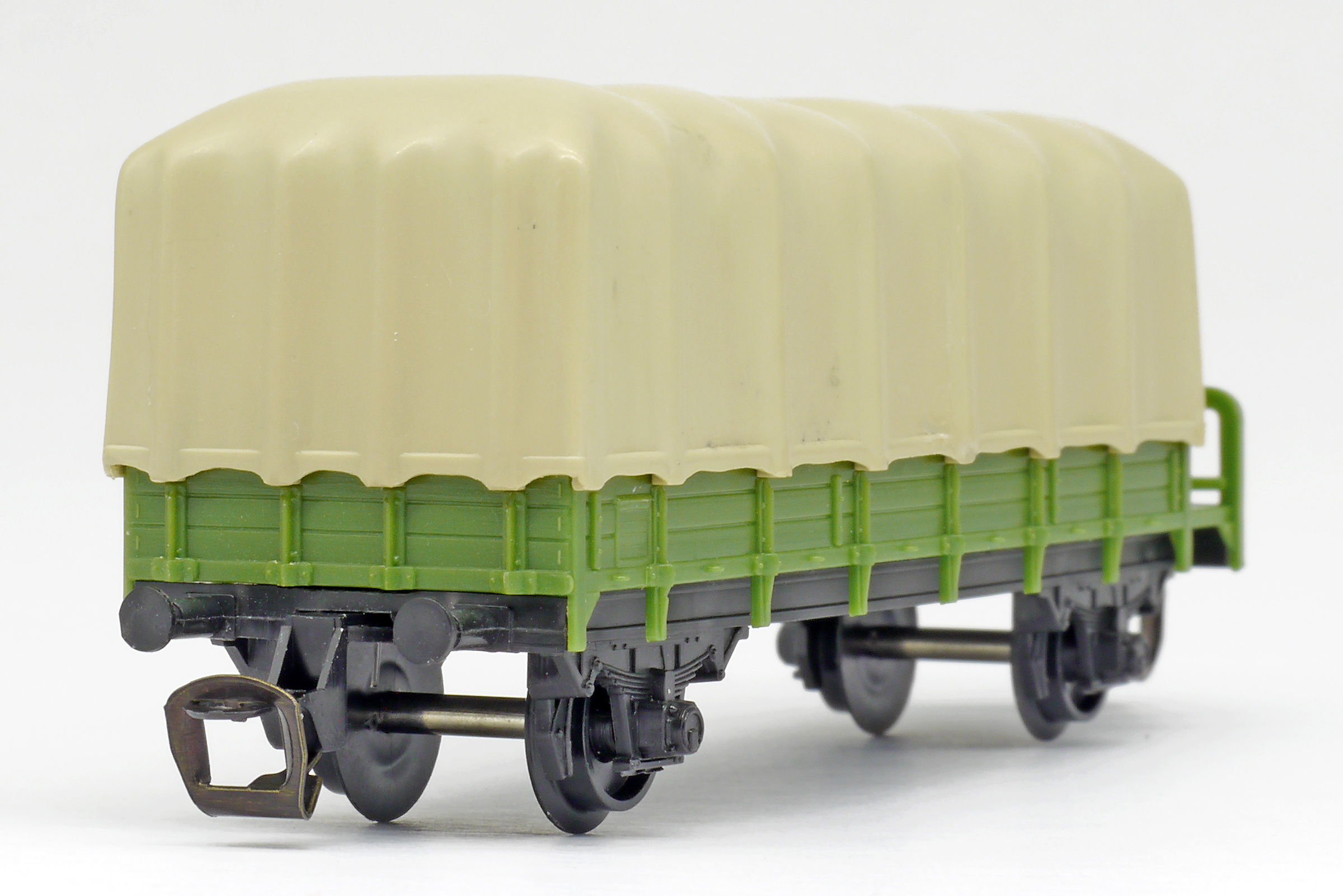 | nízkostěnný nákladní vůz zelený s brzdařskou budkou a s plachou |