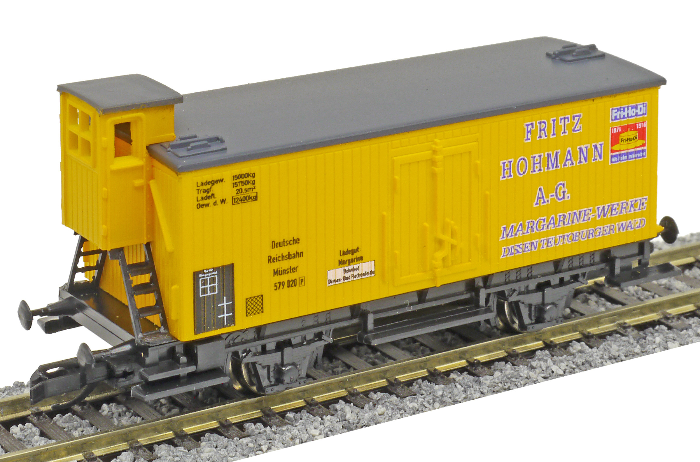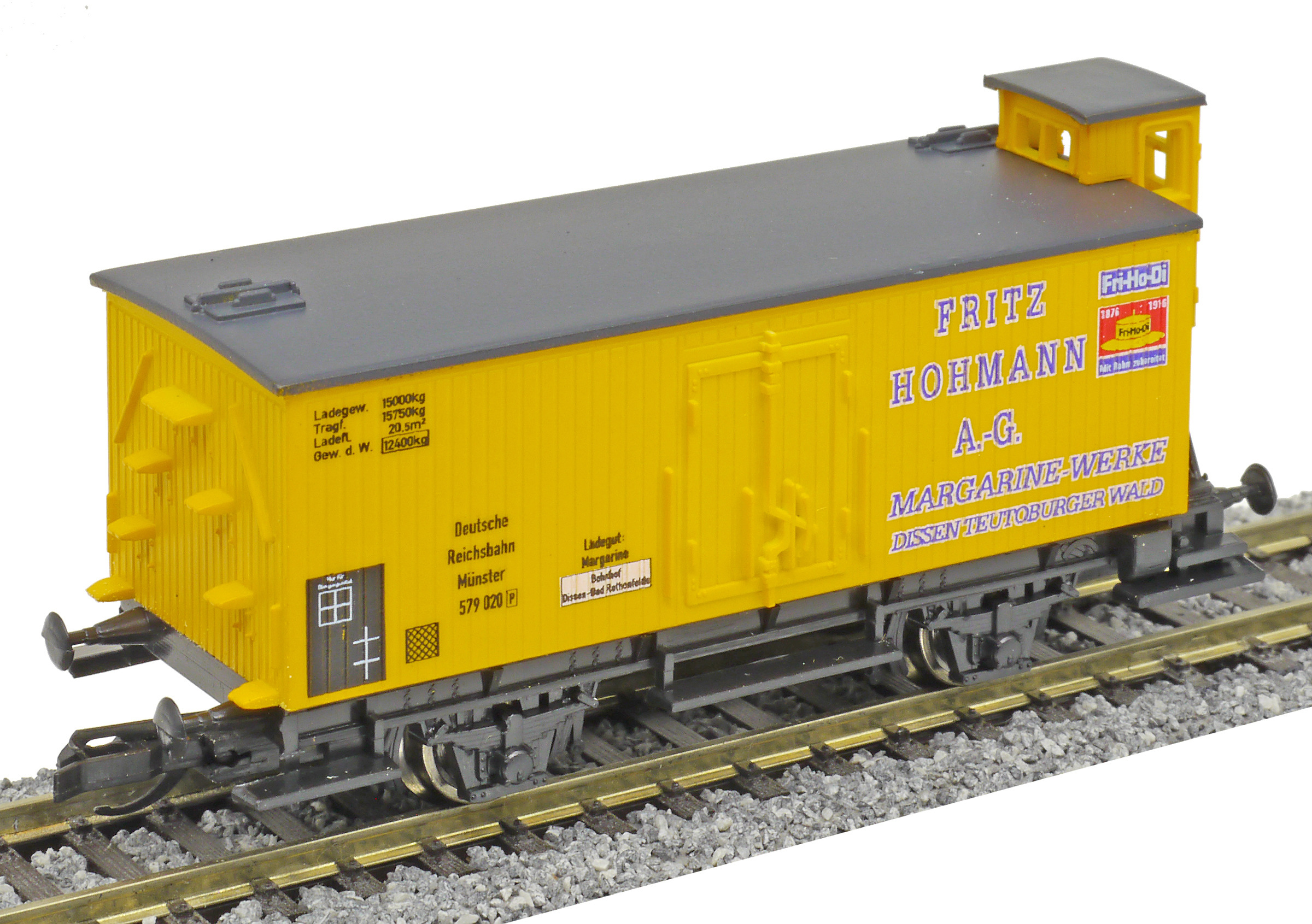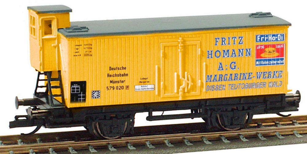 | krytý nákladní vůz žlutý s šedou střechou a brzdařskou budkou „Fritz Hohmann“ |