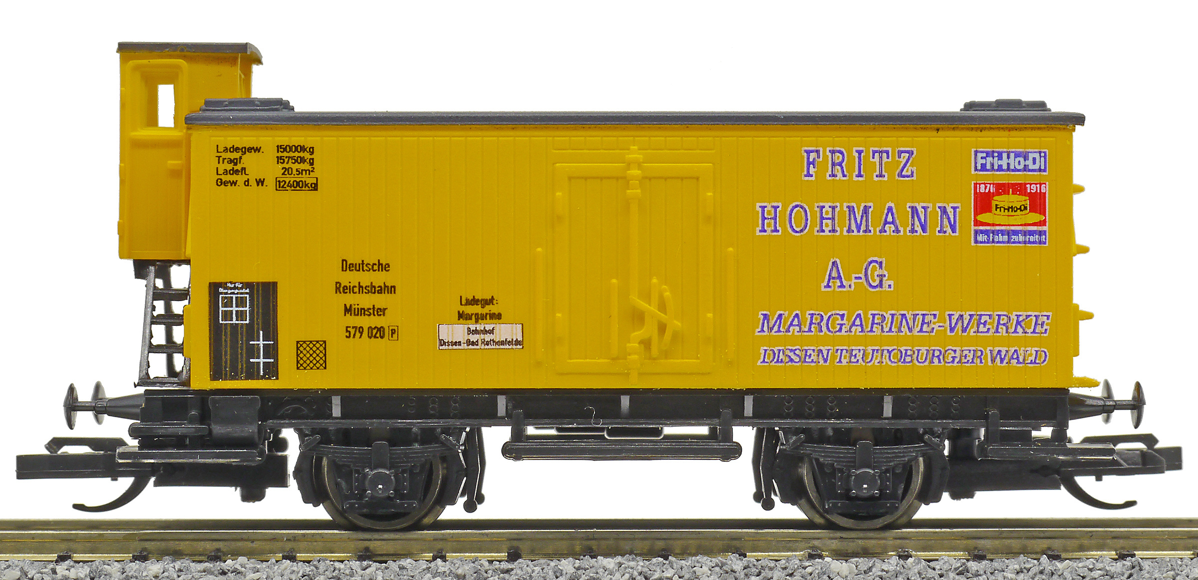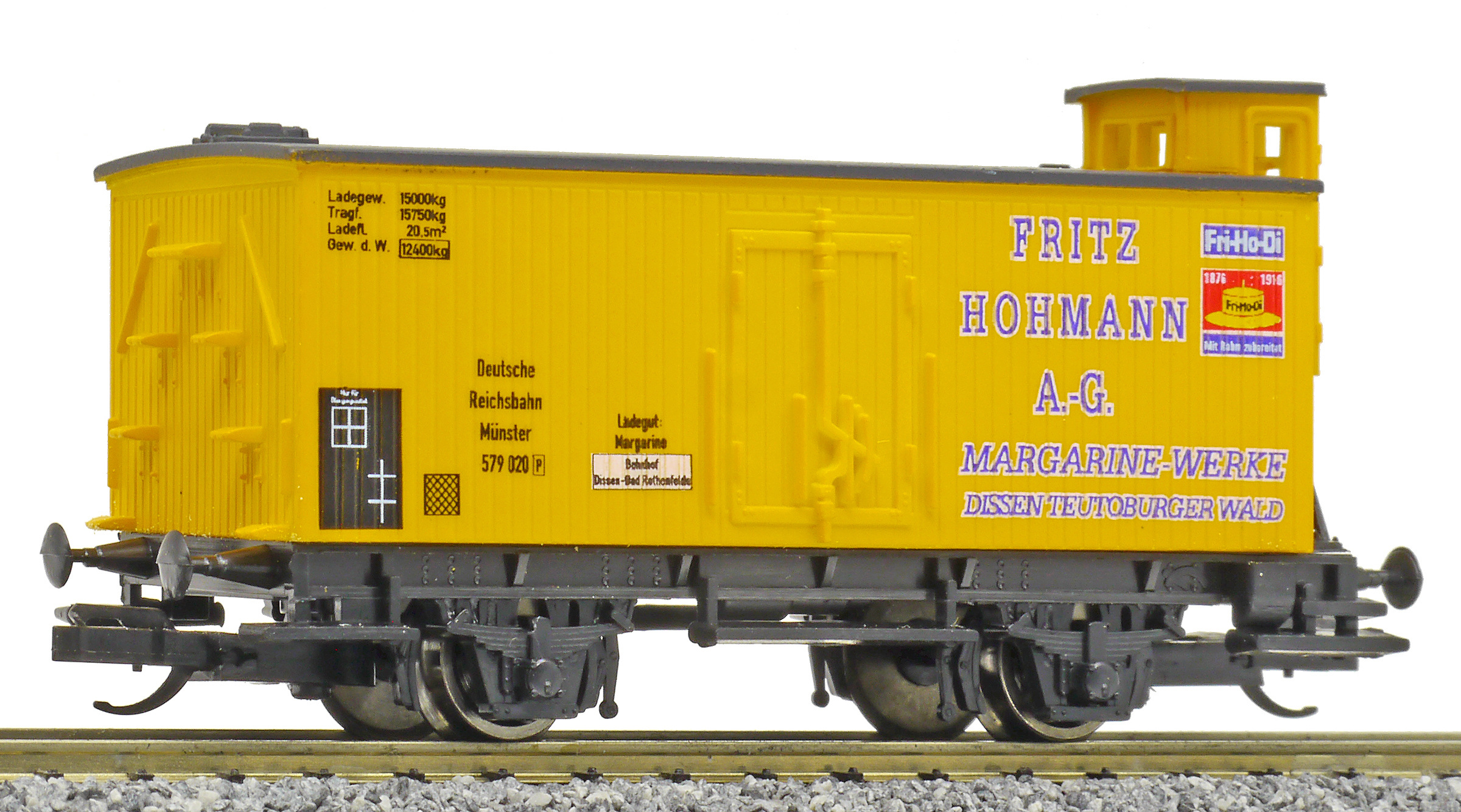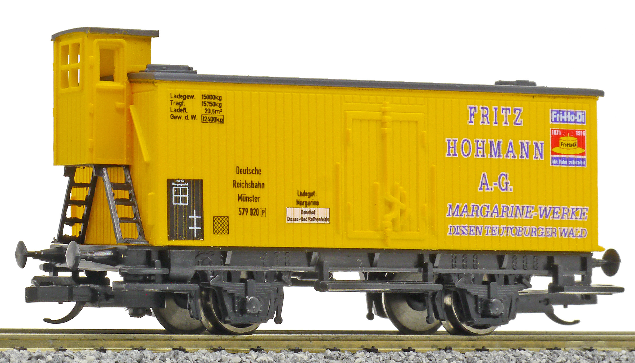 | krytý nákladní vůz žlutý s šedou střechou a brzdařskou budkou „Fritz Hohmann“ |