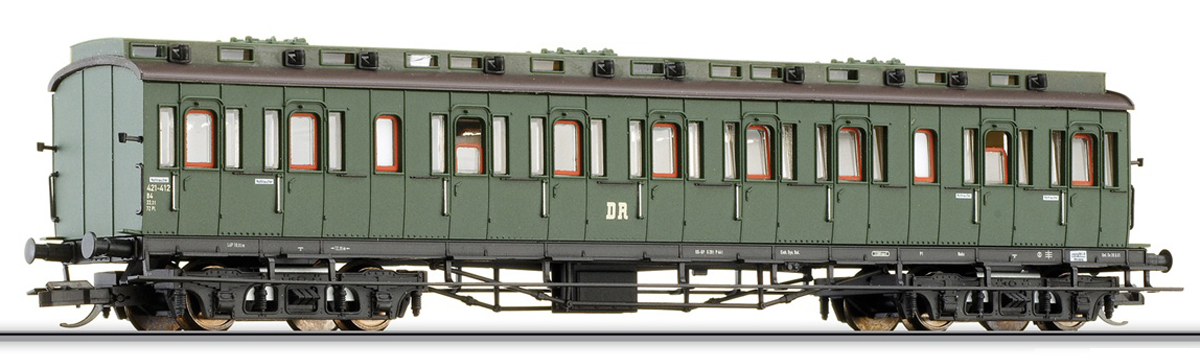 oddílový osobní vůz zelený s černou střechou a brzdařskou budkou pruské konstrukce