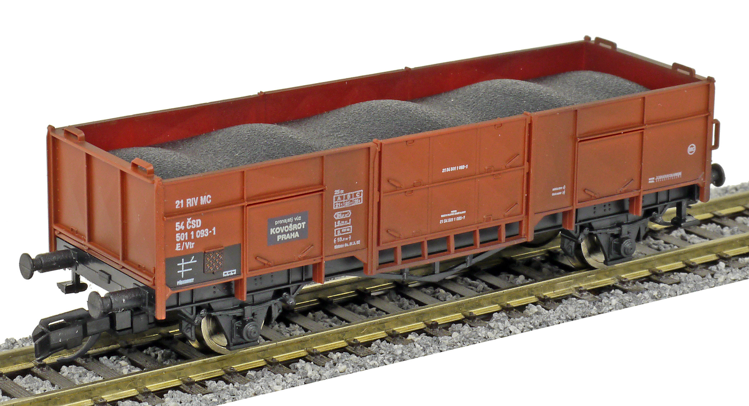 | otevřený nákladní vůz červenohnědý s nákladem uhlí „Kovošrot Praha“ |