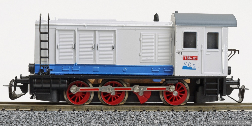 | dieselová lokomotiva bílá s černým pojezdem „VČS“ |