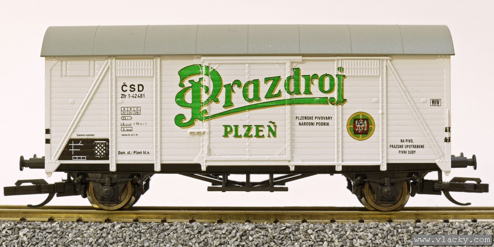 | krytý nákladní vůz bílý s šedou střechou „Prazdroj“ |