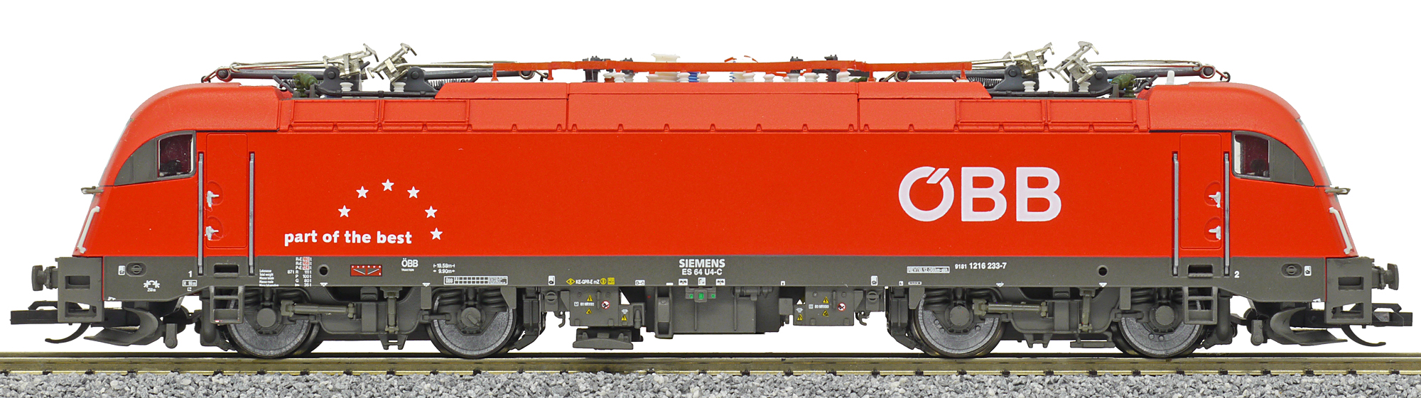 měřítko 1:120 - rozchod kolejí 12 mm osvětlení - 3 reflektory vpředu, 2 světla vzadu, přepínatelné podle směru jízdy kinematika krátkého spřáhla (KKK) podle normy NEM 358 digitální rozhraní podle NEM 658 s konektorem PluX12 možný provoz s pantografem 163 mm - celková délka modelu přes nárazníky 4 - celkový počet náprav nebo rozložení náprav 280 g - hmotnost brutto - model včetně prodejního obalu