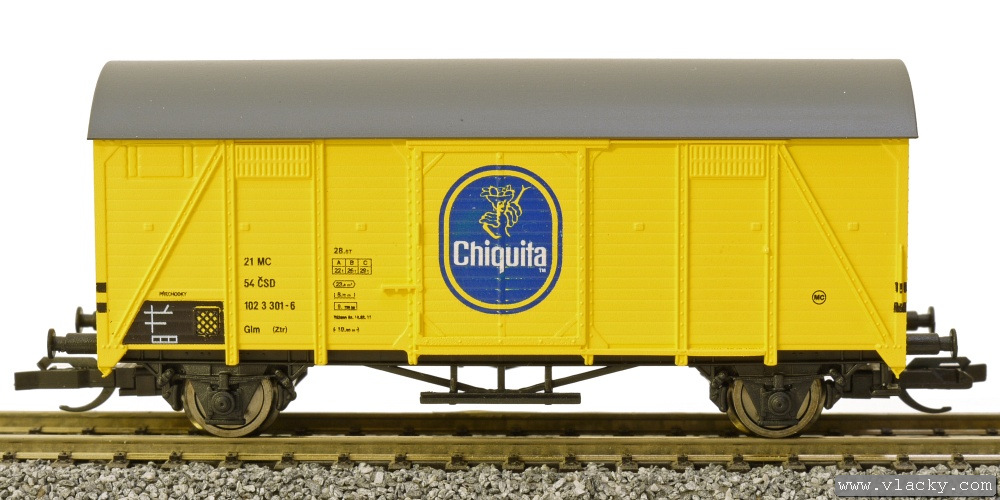 | krytý nákladní vůz žlutý s šedou střechou „Chiquita” |