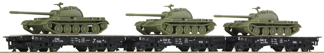 | set tří plošinových vozů s nákladem tanků T55 |
