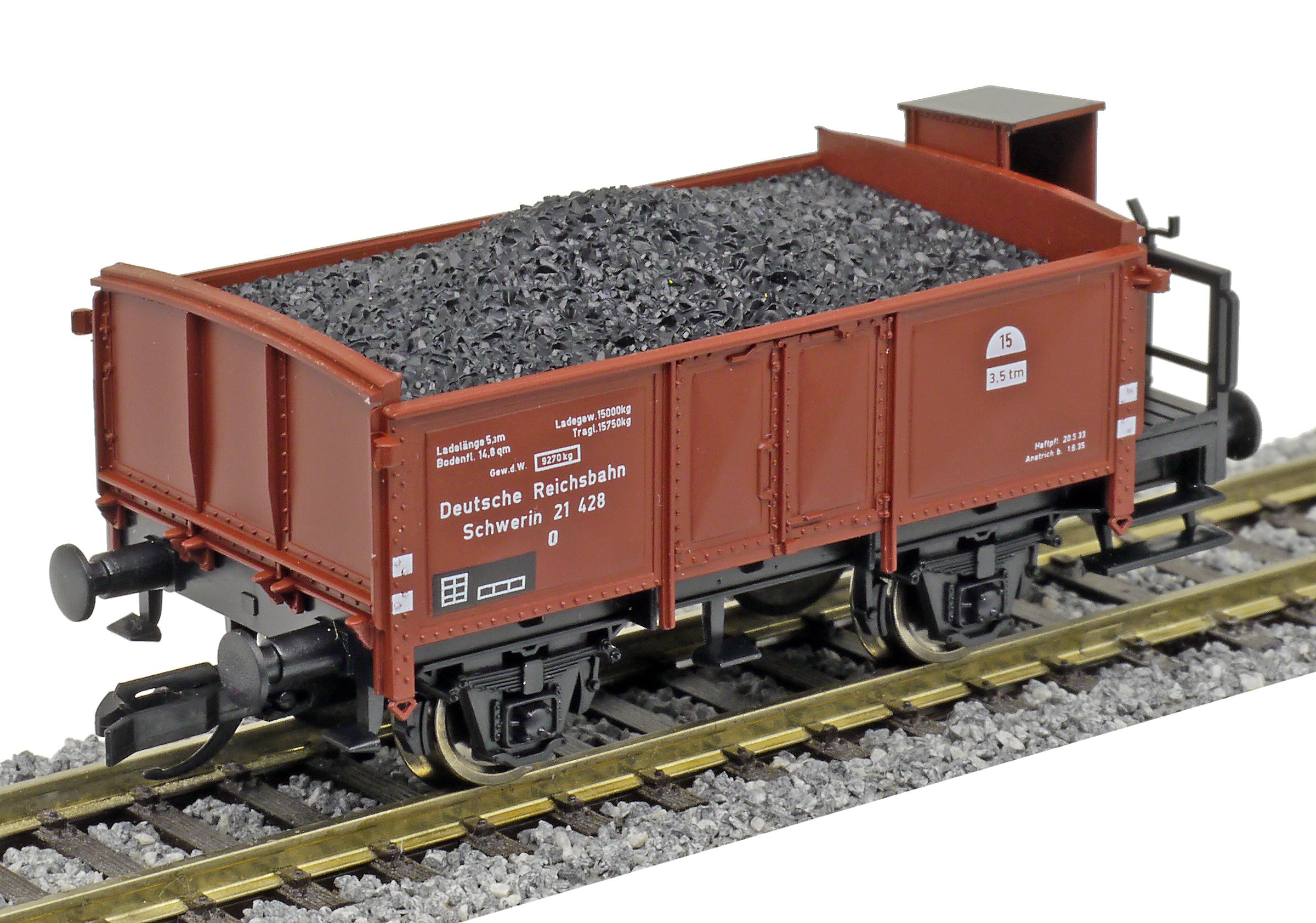 | otevřený nákladní vůz červenohnědý s brzdařskou budkou ložený uhlím |