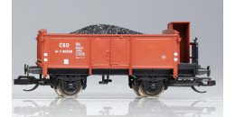 | otevřený nákladní vůz červenohnědý s brzdařskou plošinou ložený uhlím |