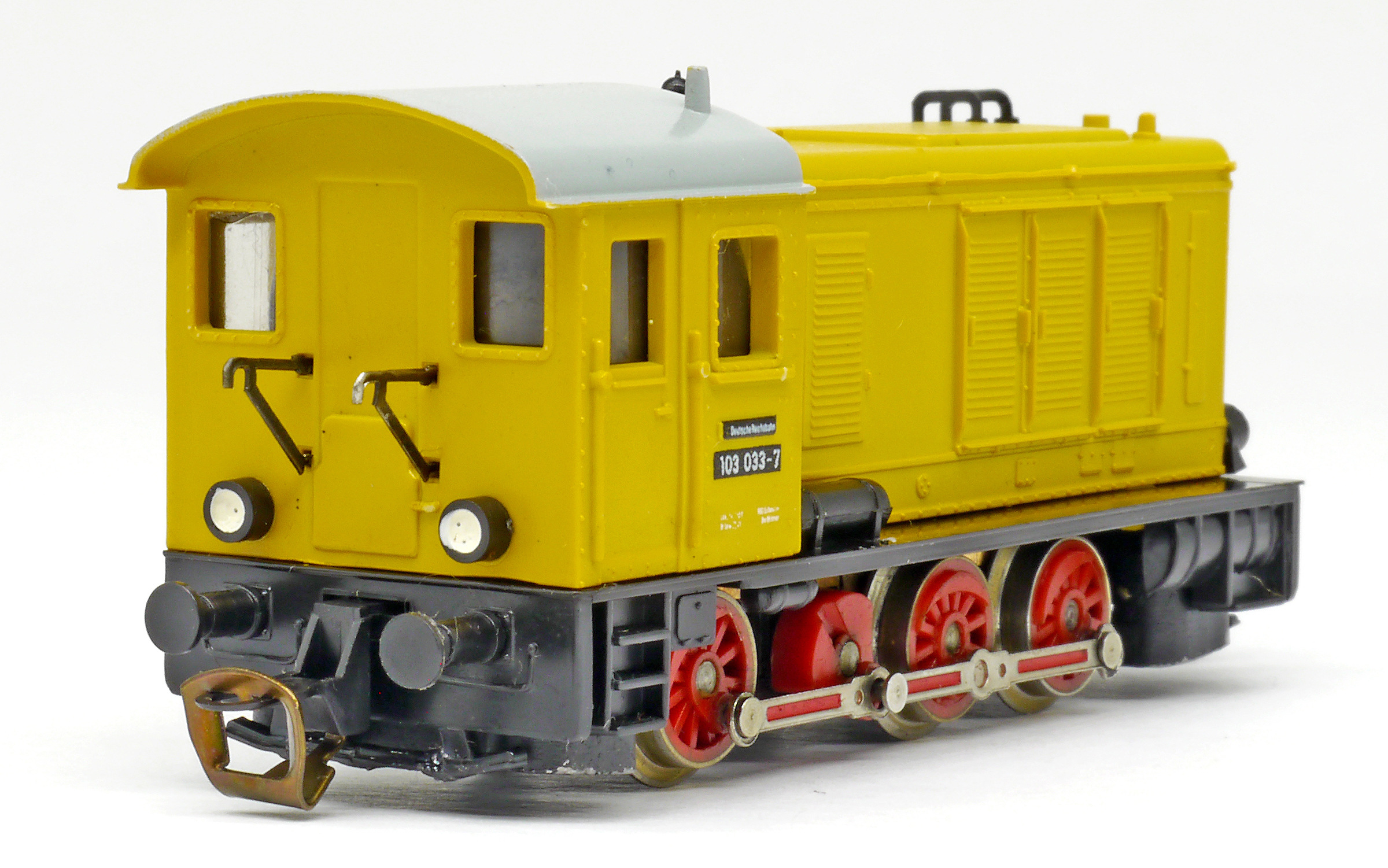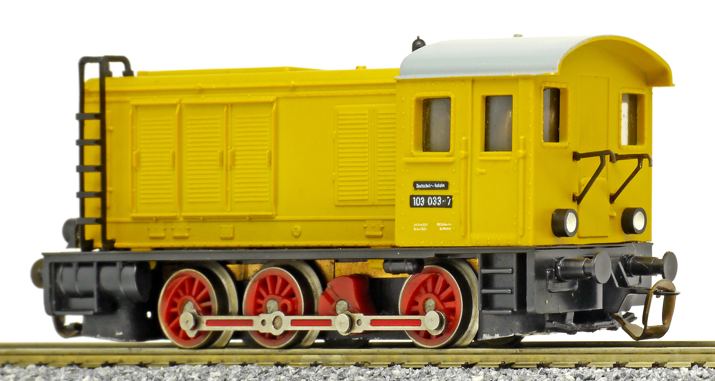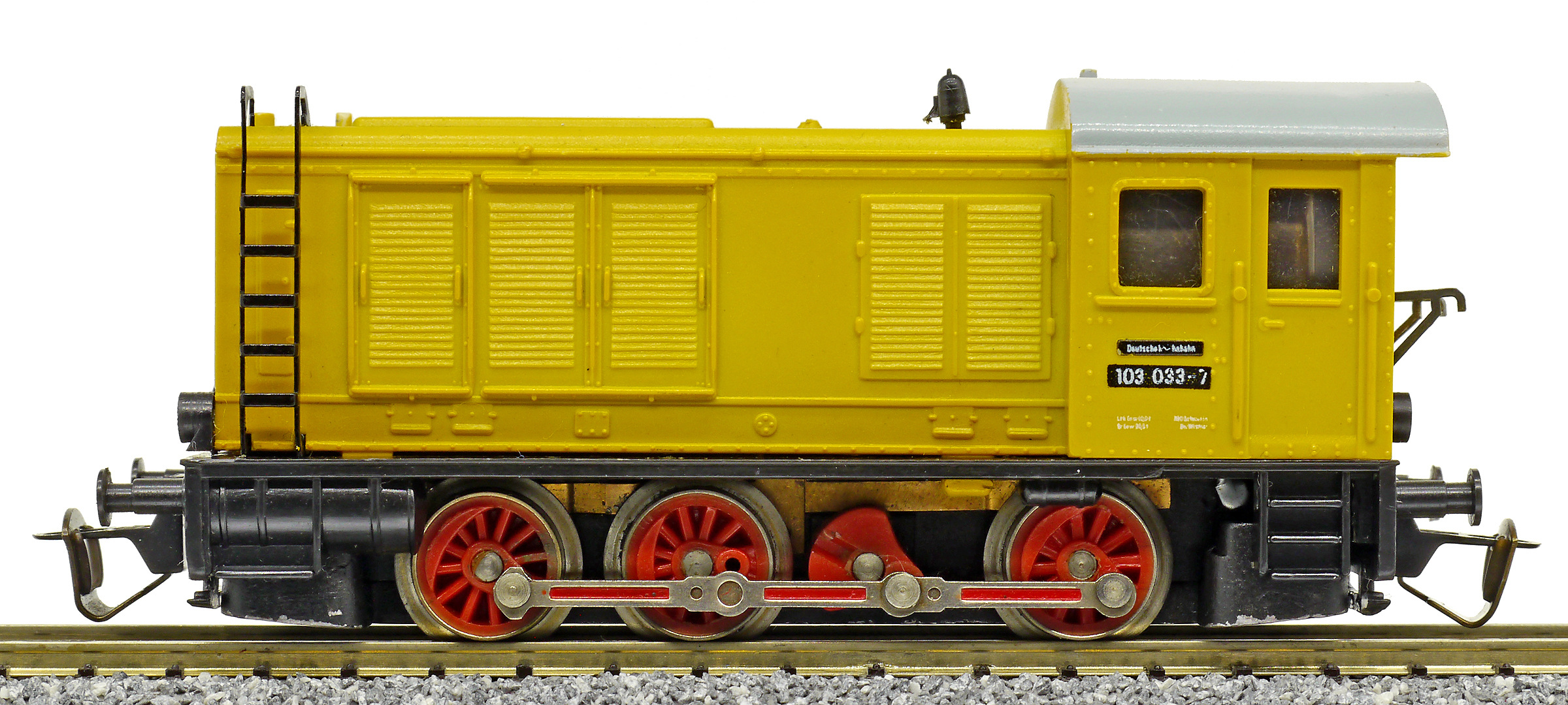 Popis   dieselová lokomotiva žlutá s černým rámem a červenými koly