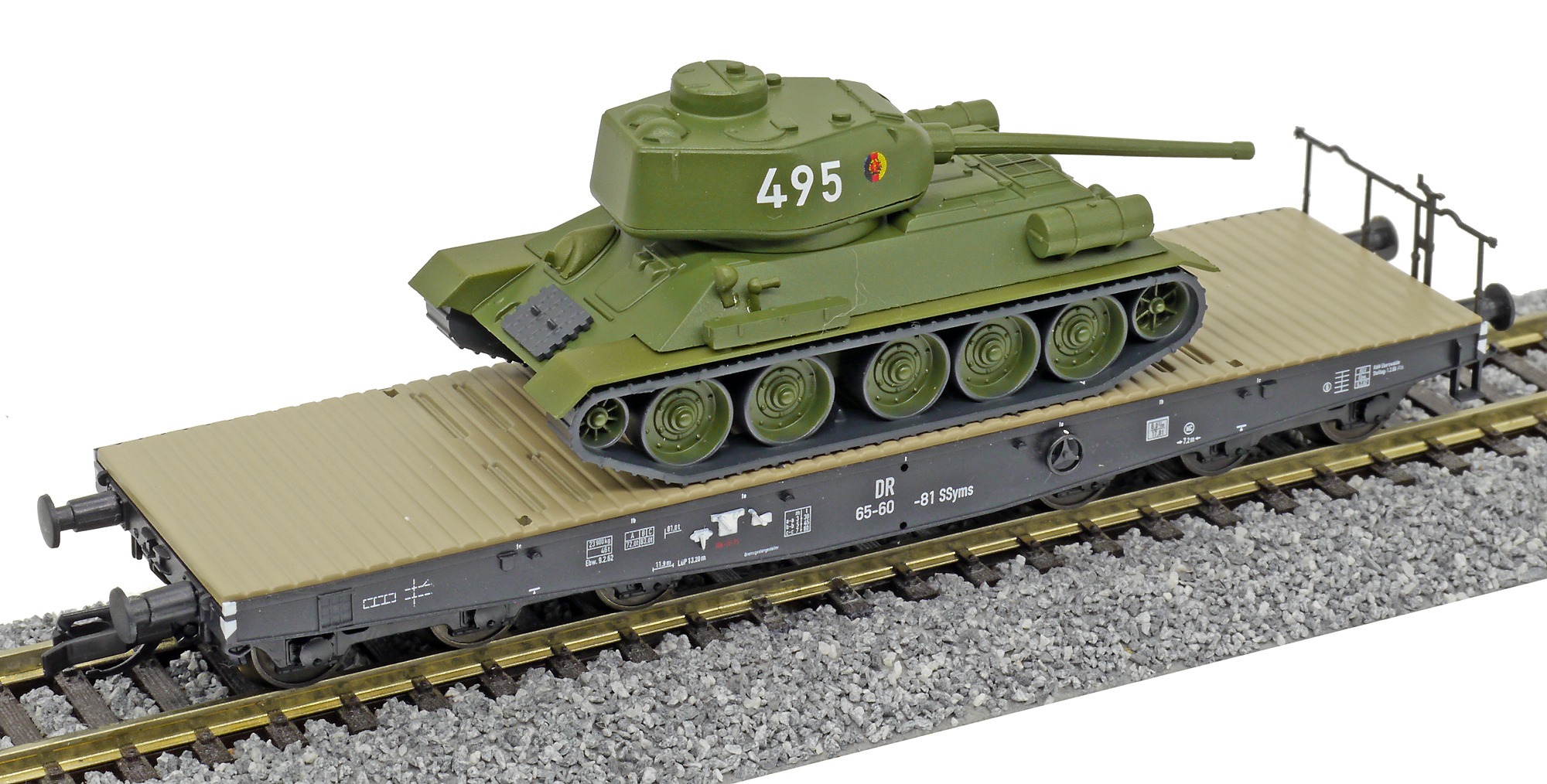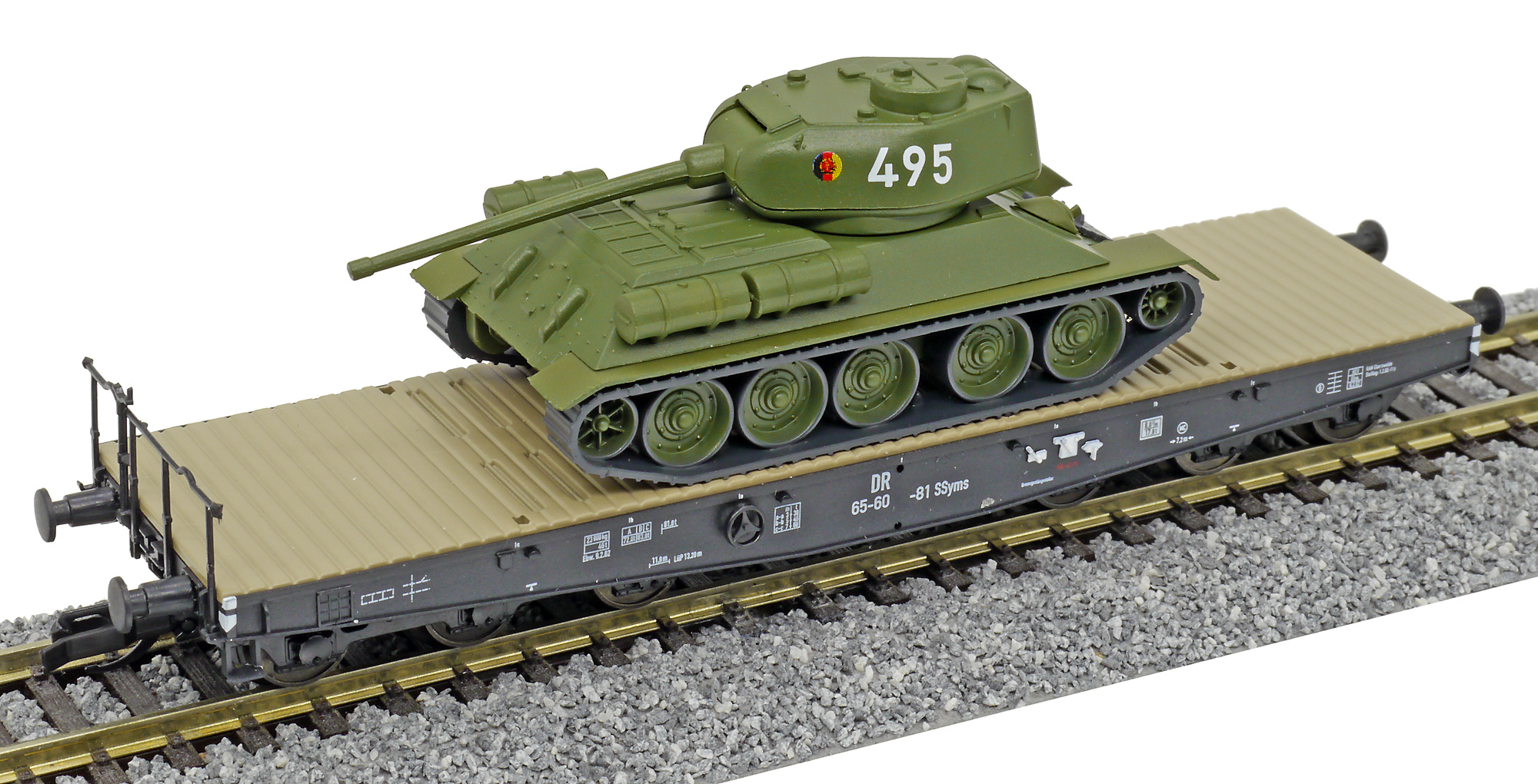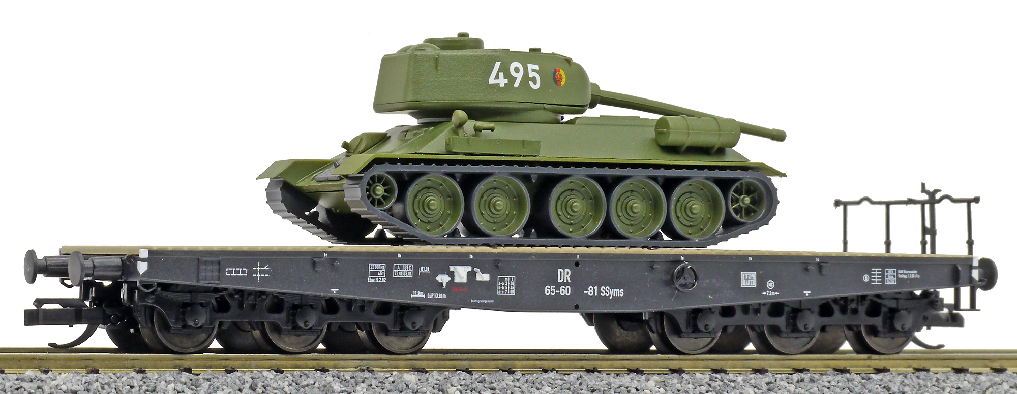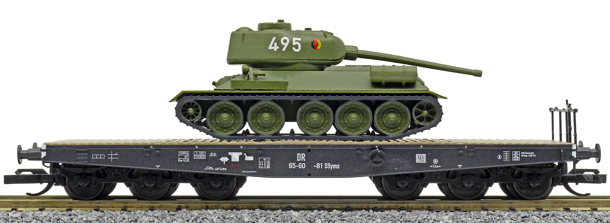 plošinový nákladní vůz černý s nákladem tanku T38/85