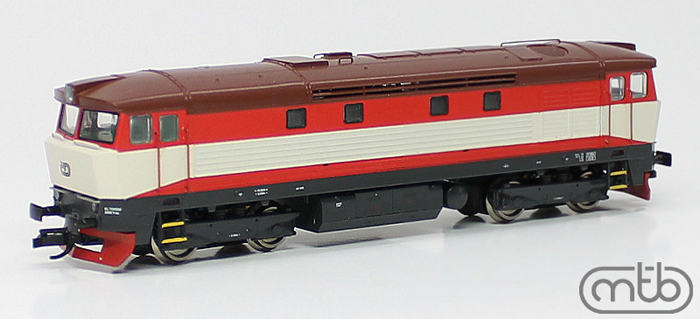 Popis   dieselová lokomotiva červená-slonová kost, červenohnědá střecha, černý rám a podvozky