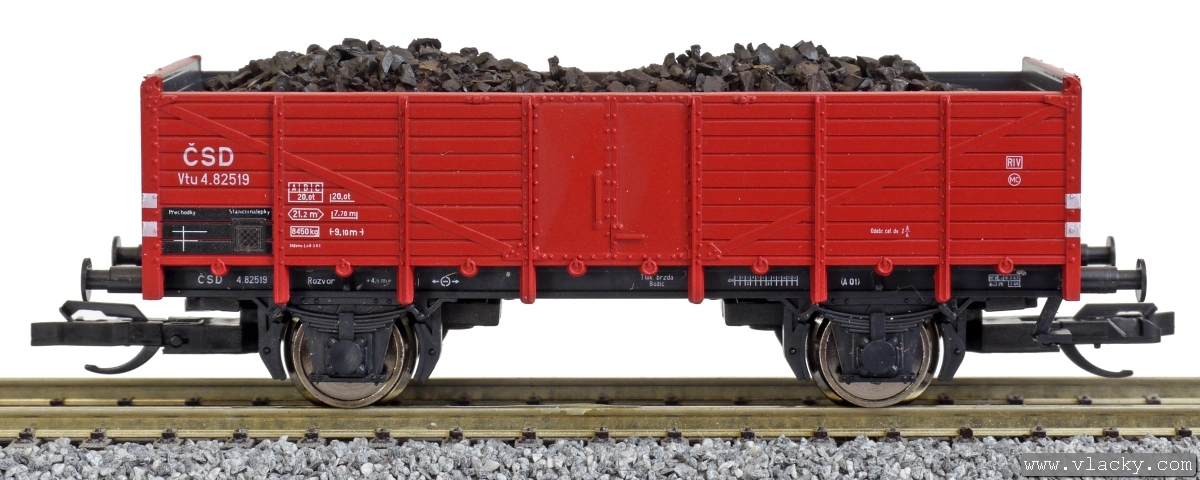 | otevřený nákladní vůz červenohnědý ložený uhlím |