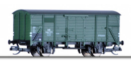 | krytý nákladní vůz zelený s tmavě šedou střechou do stavebního vlaku „Bauzug“ |