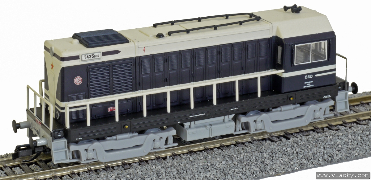 | dieselová lokomotiva tmavě modrá-světle šedá, černý rám a šedý pojezd |
