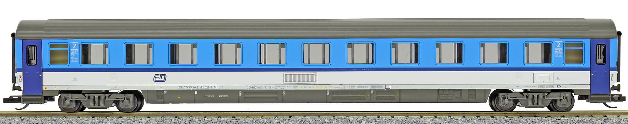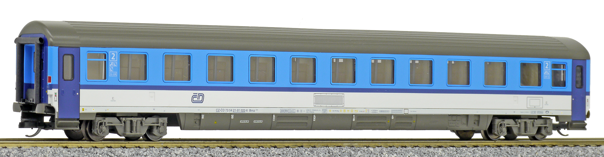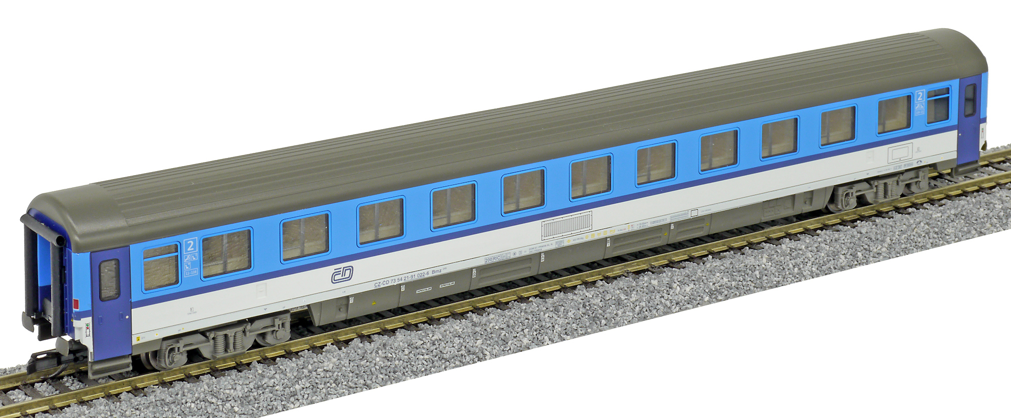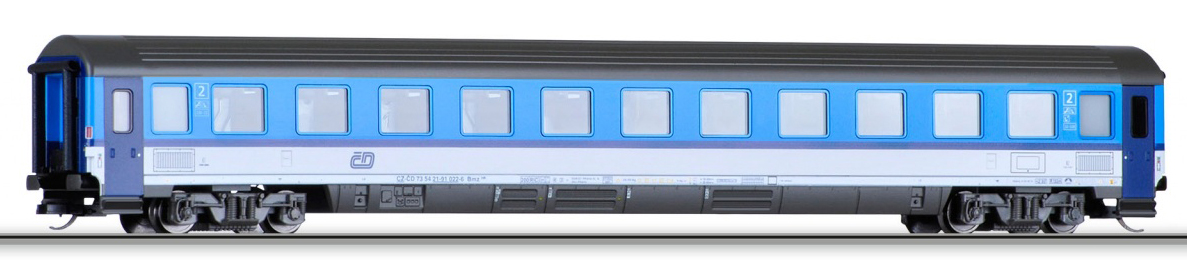 rychlíkový vůz v barevném schematu „Najbrt“ 2. tř.