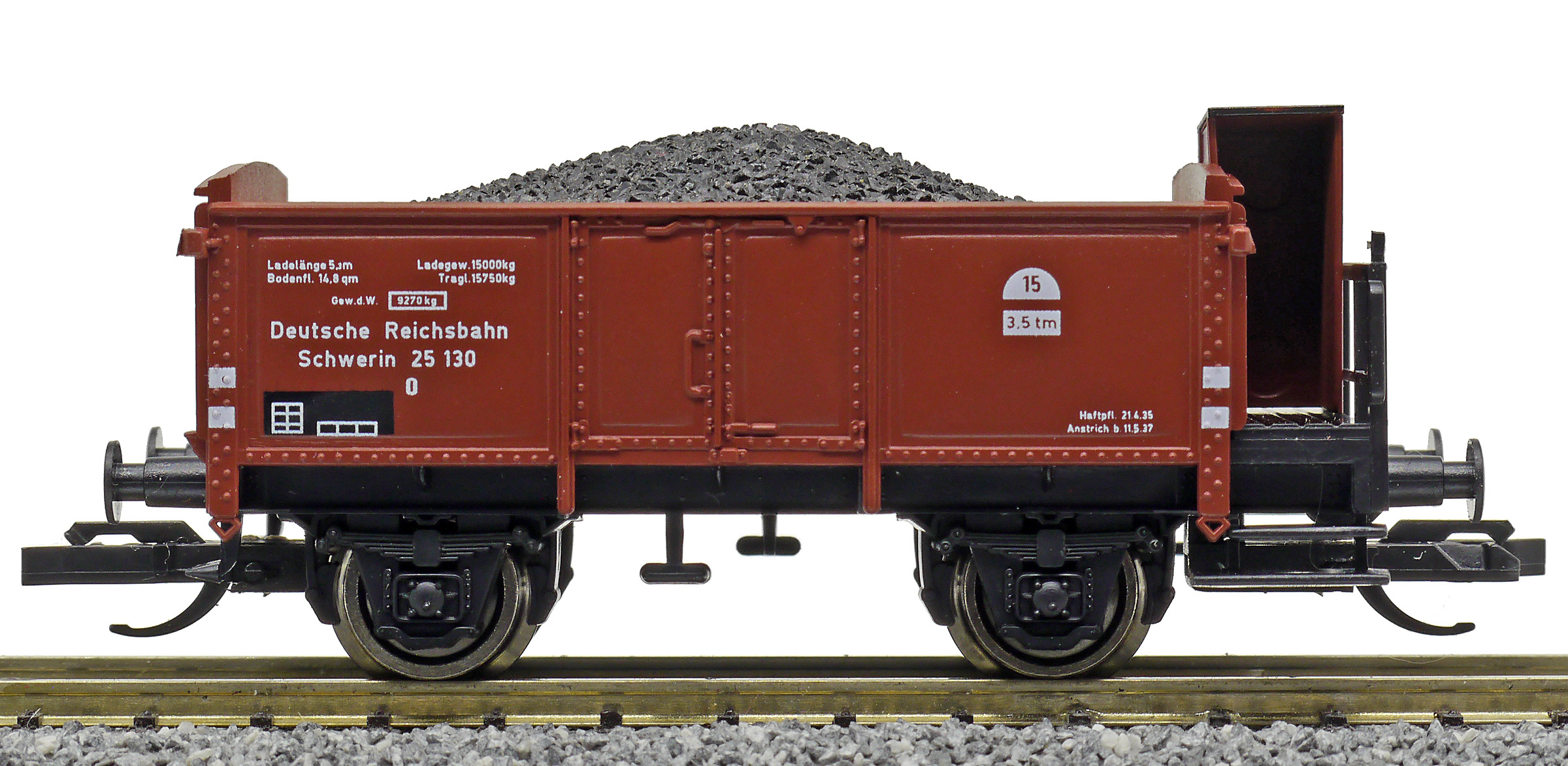 | otevřený nákladní vůz červenohnědý s brzdařskou budkou ložený uhlím |