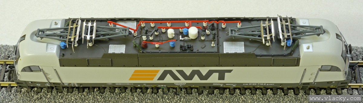 | elektrická lokomotiva světle šedá s černým rámem a pojezdem „AWT“ |