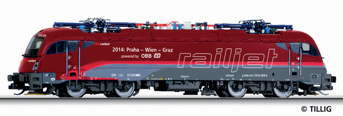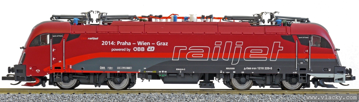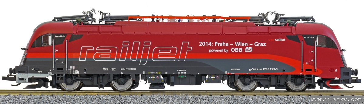 Popis   elektrická lokomotiva Railjet v barevném schematu „Spirit of Praha“
