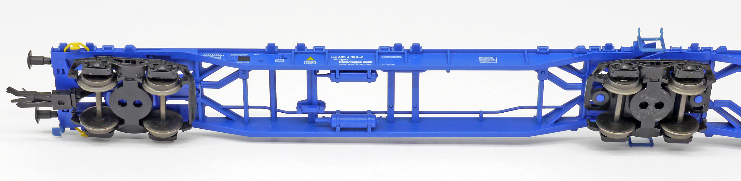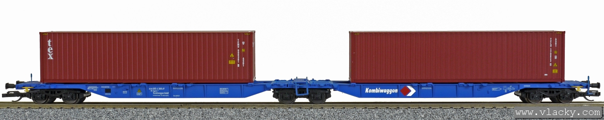 | dvoudílný kontejnerový vůz modrý „Kombiwaggon“ se dvěma kontejnery |