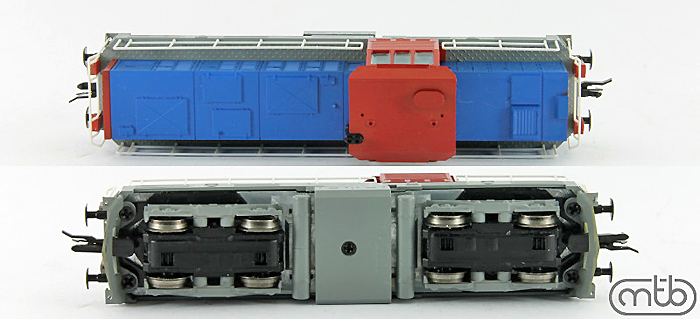 Popis   dieselová lokomotiva červená-modrá s šedým rámem a pojezdem