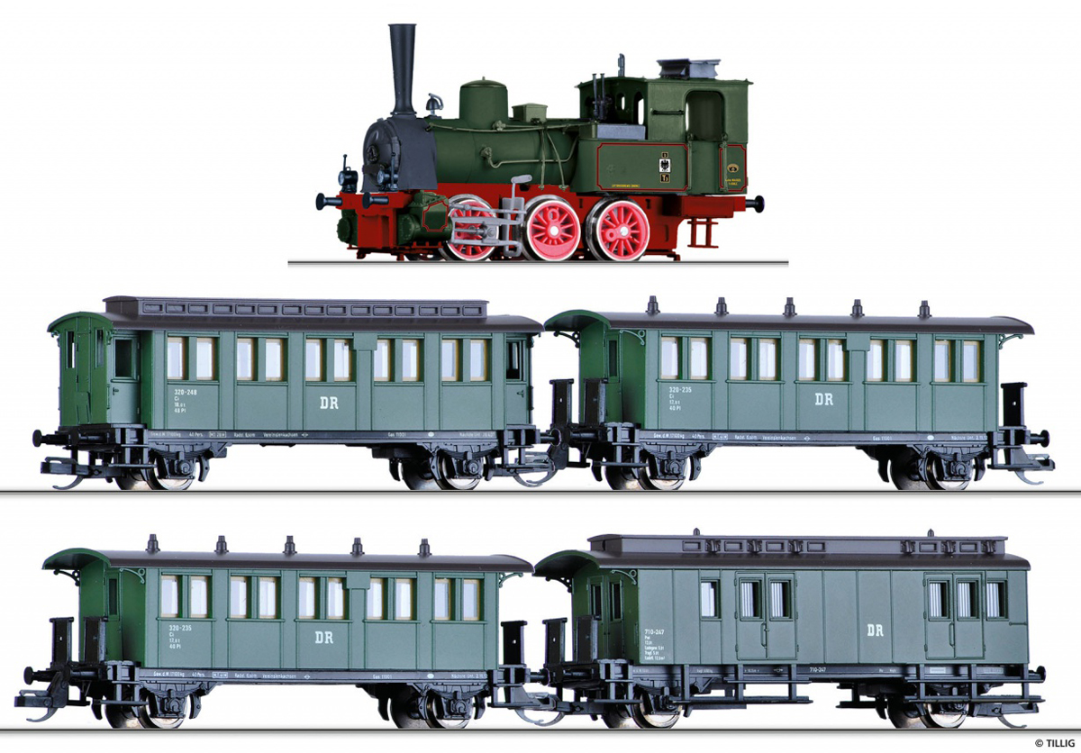 | set parní lokomotivy T3 a čtyř osobních vozů |