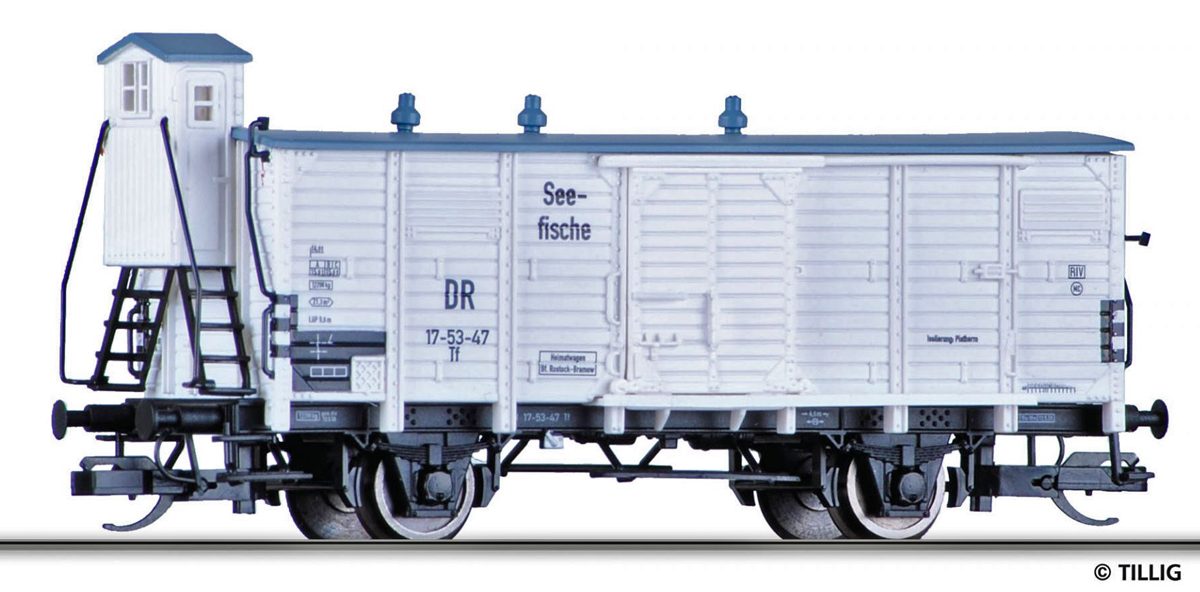 | krytý nákladní vůz šedý s brzdařskou budkou „Seefische“ |