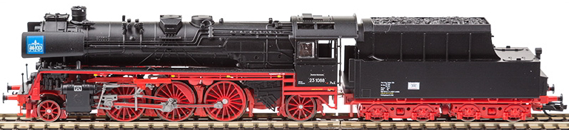 | parní lokomotiva černá s červeným pojezdem a kouřovými plechy, Design der Messelok 1965 |