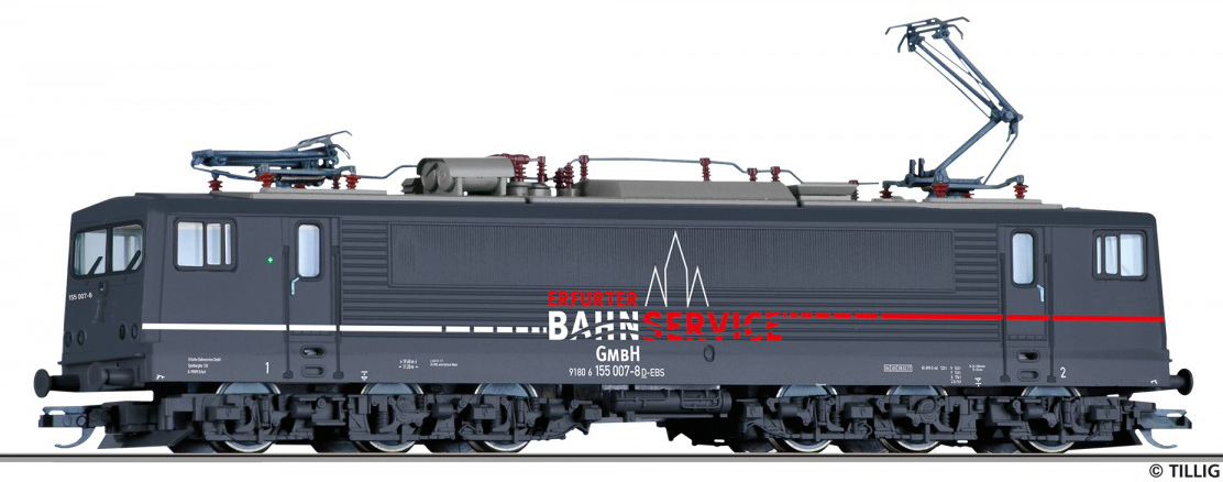 | elektrická lokomotiva černá s šedou střechou „Erfurter Bahnservice GmbH“ |