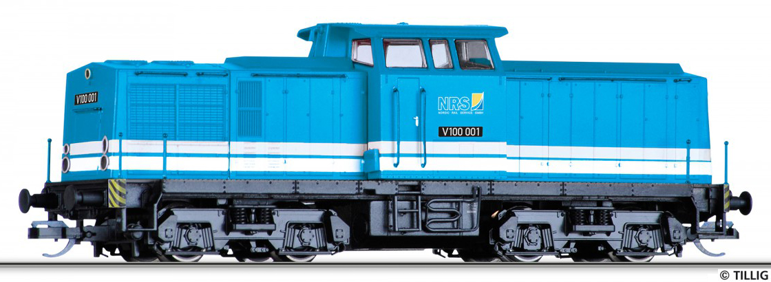 | dieselová lokomotiva modrá s bílými pruhy „Nordic Rail Service GmbH“ |