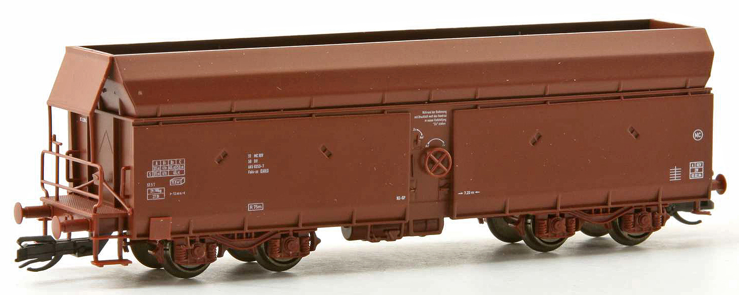 | samovýsypný vůz červenohnědý s brzdařskou plošinou se stříškou |