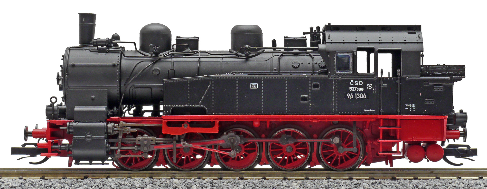 Popis   parní lokomotiva černá s červeným pojezdem