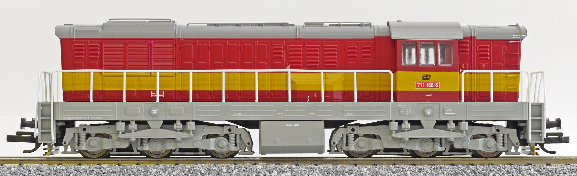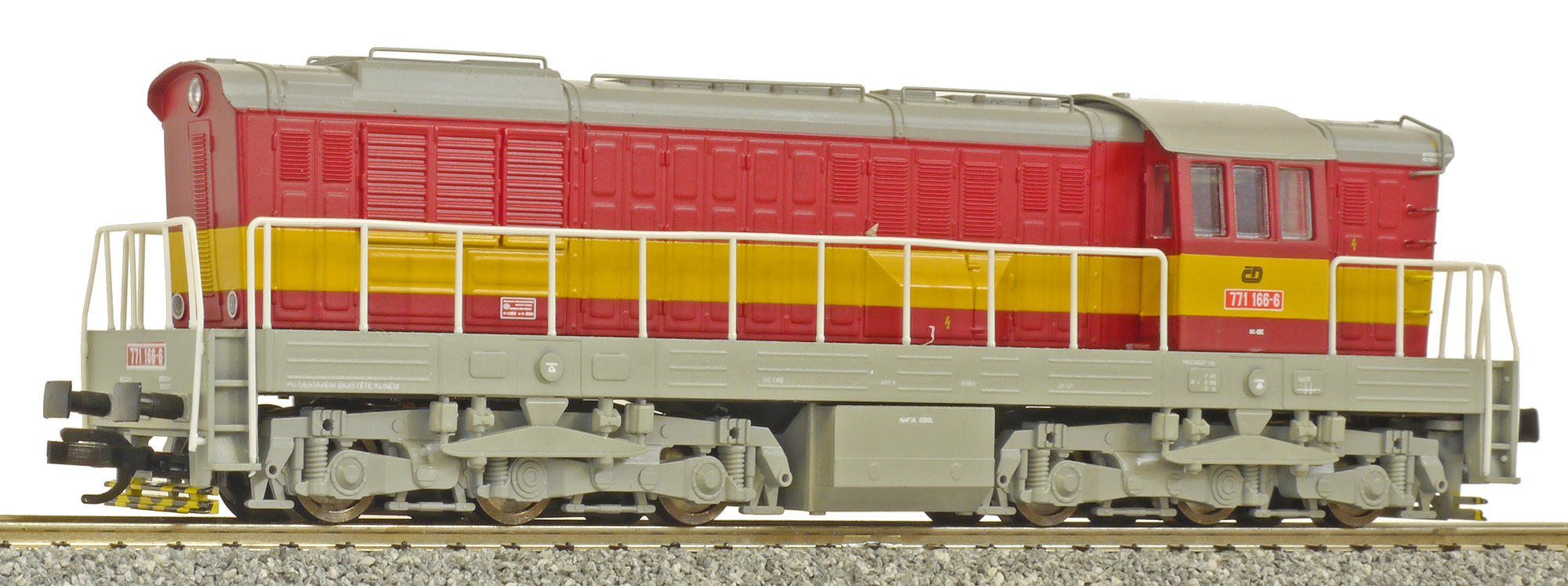 | dieselová lokomotiva červená s výstražným pruhem, šedá střecha, rám a pojezd |
