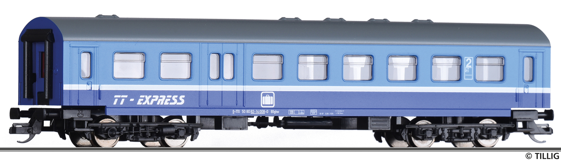 | osobní vůz v odstínech modré s šedou střechou 2. tř. a zavazadlovým oddílem „TT-Express“ |