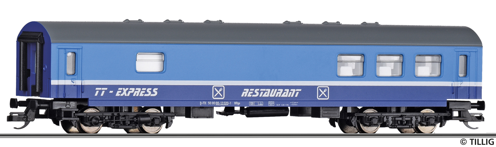 | jídelní vůz v odstínech modré s šedou střechou „TT-Express“ |