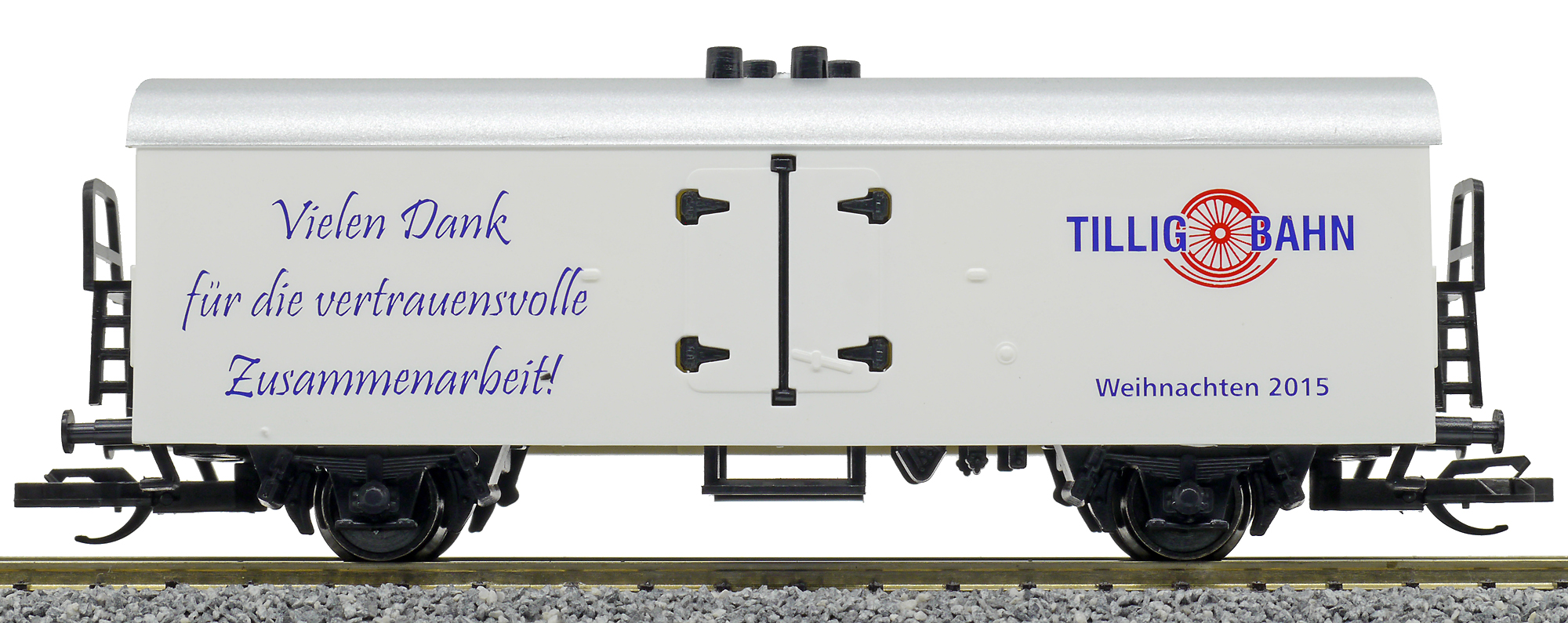 | chladící vůz bílý s šedou střechou a s reklamním potiskem „Weihnachten 2015“ |