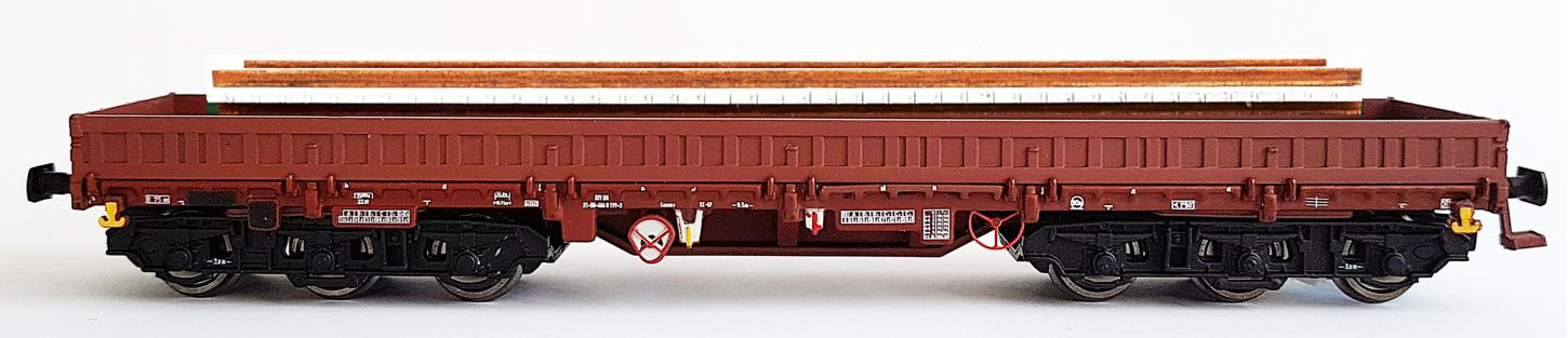 nízkostěnný nákladní vůz červenohnědý s nákladem dlouhého zásobníku pražců