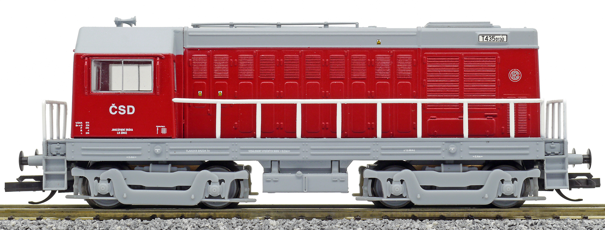 | dieselová lokomotiva červená s šedým rámem a podvozky |