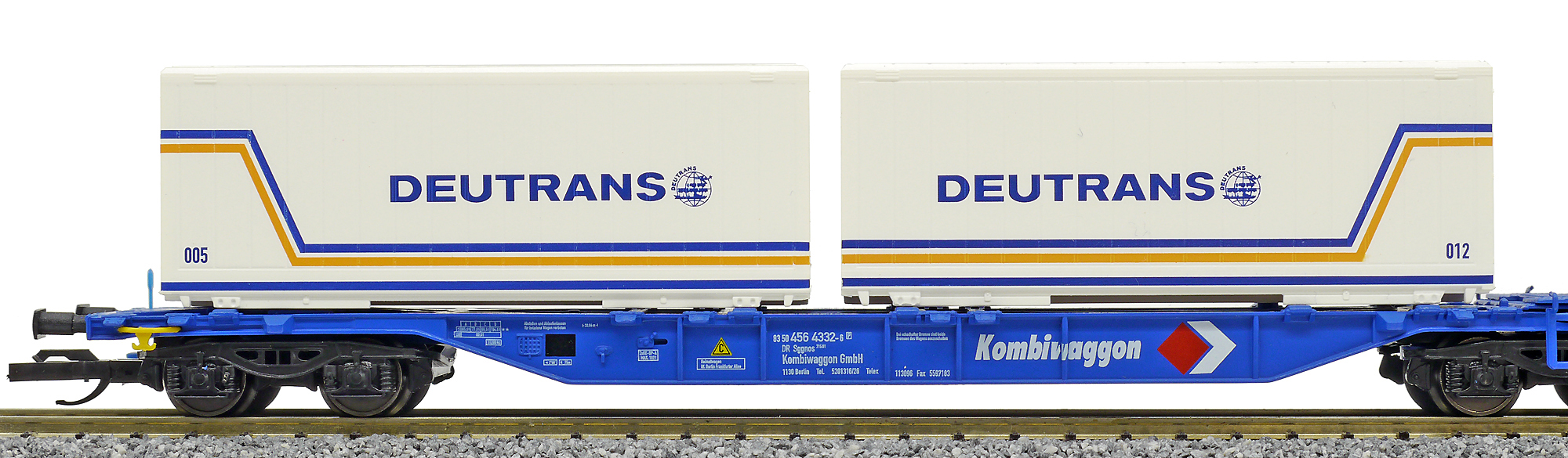 | dvoudílný kontejnerový vůz modrý „Kombiwaggon“ se čtyřmi kontejnery 20' „Deutrans“ |