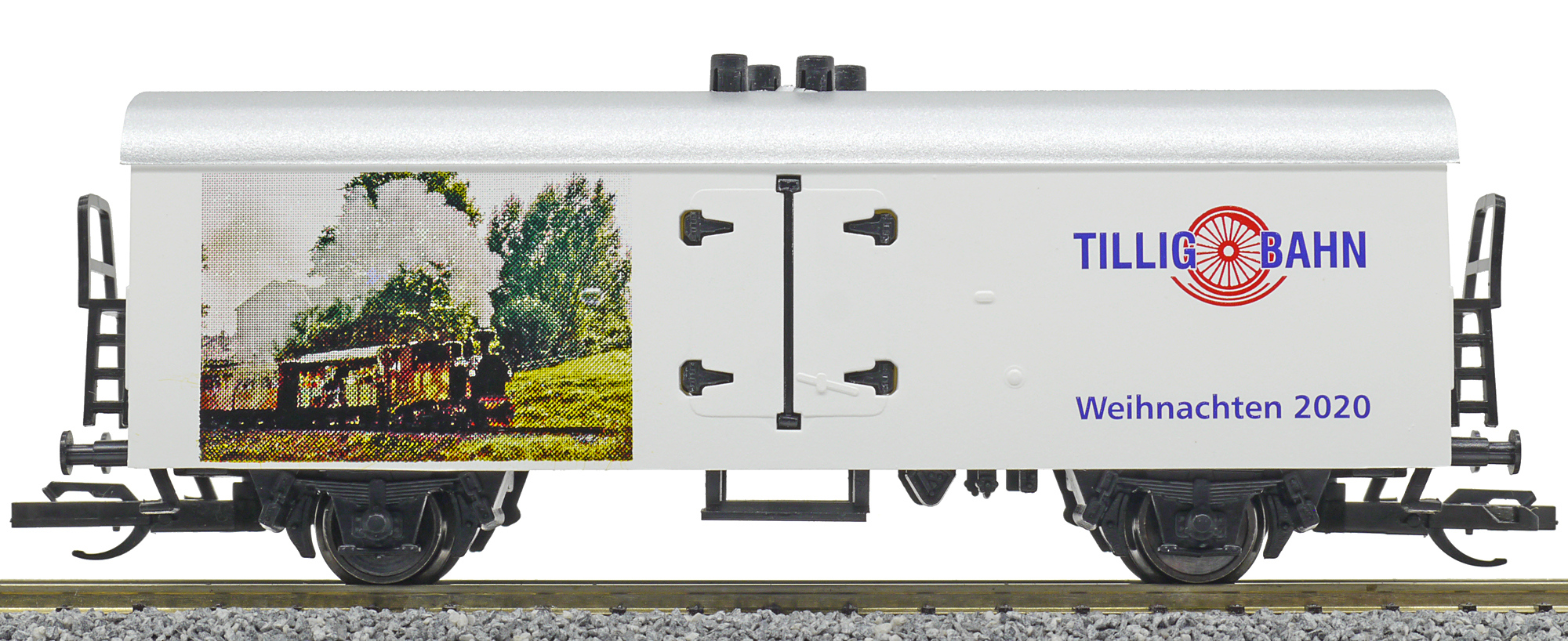 | chladící vůz bílý s šedou střechou a s reklamním potiskem „Weinachten 2020“ |
