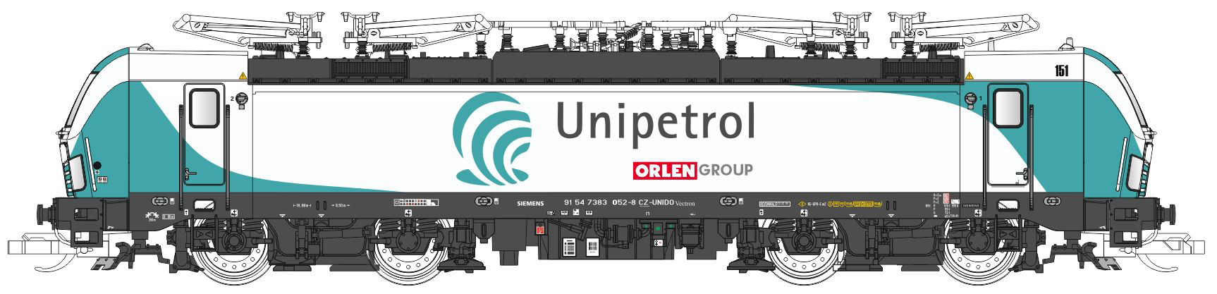 | elektrická lokomotiva v barevném schematu „Unipetrol“ |