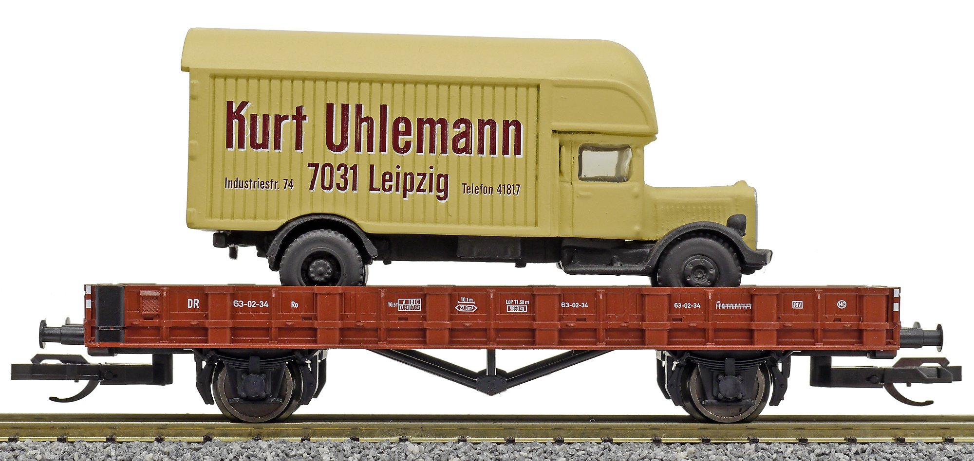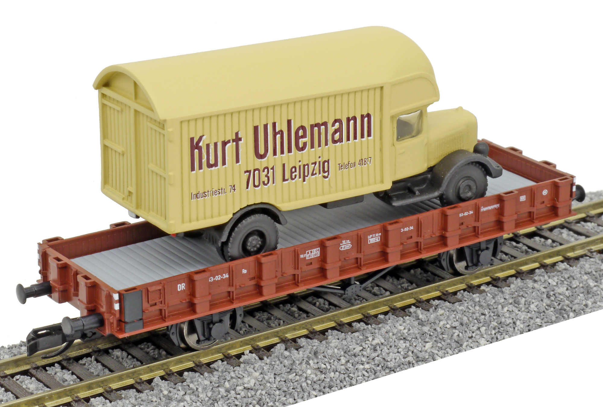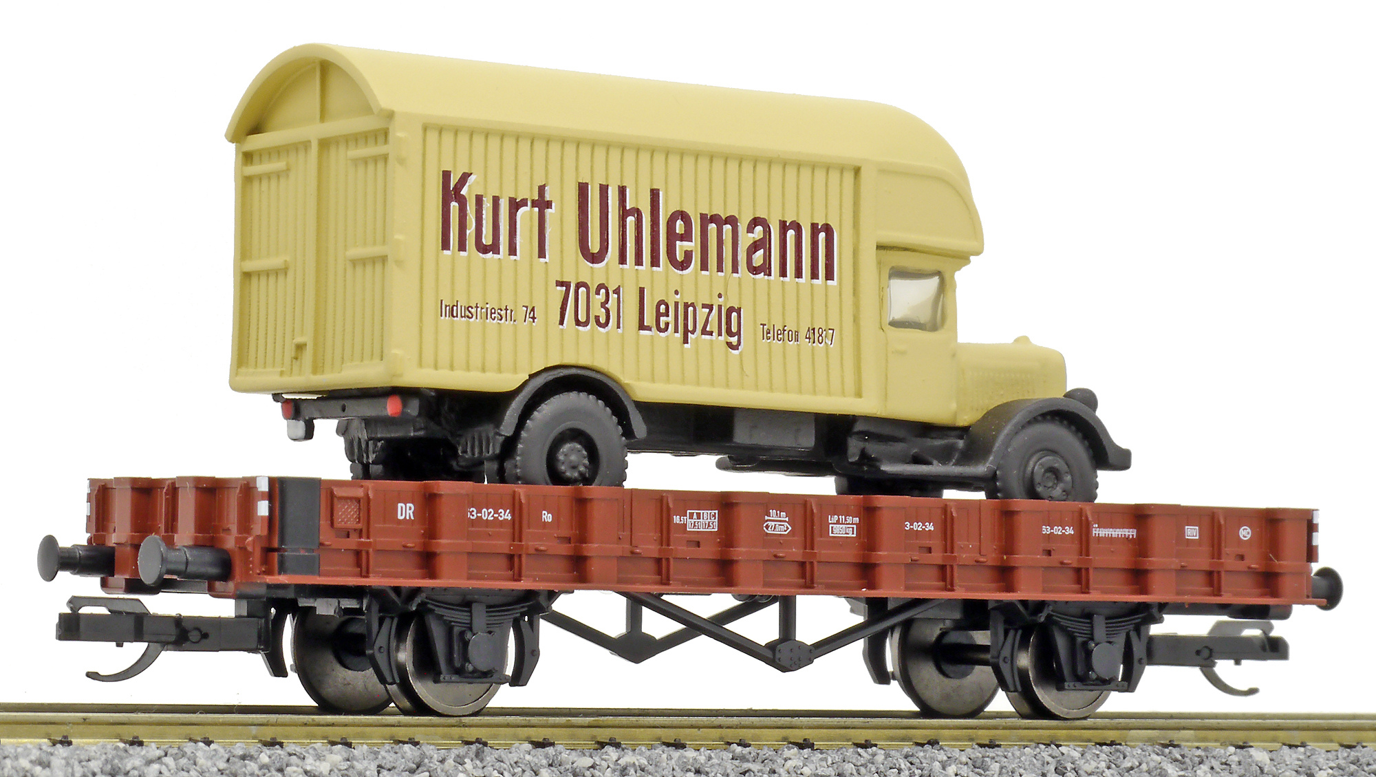 | nízkostěnný vůz červenohnědý s nákladem automobilu „Kurt Uhlemann, Leipzig“ |