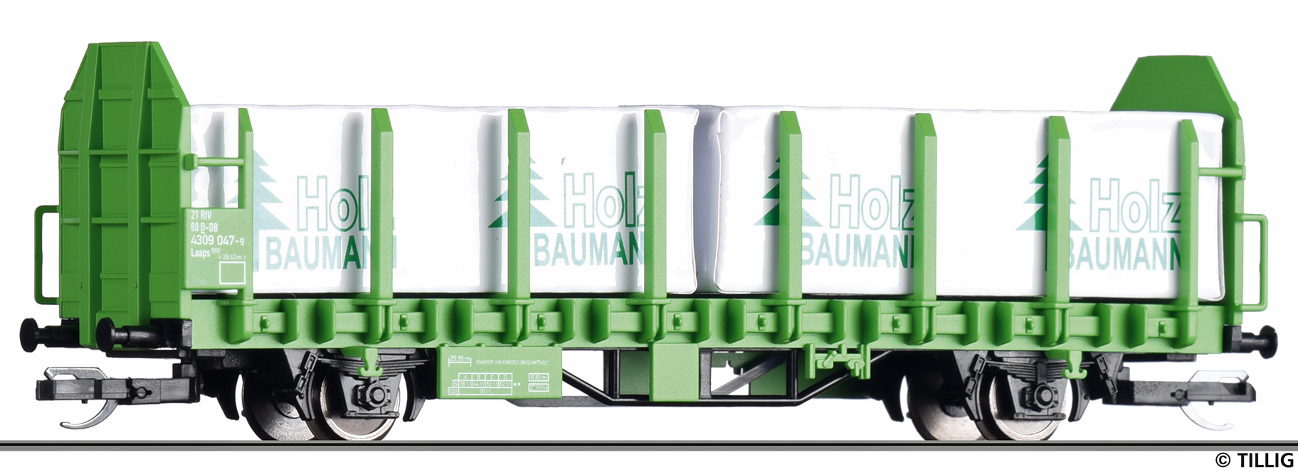 | nízkostěnný vůz s klanicemi zelený ložený baleným dřevem |