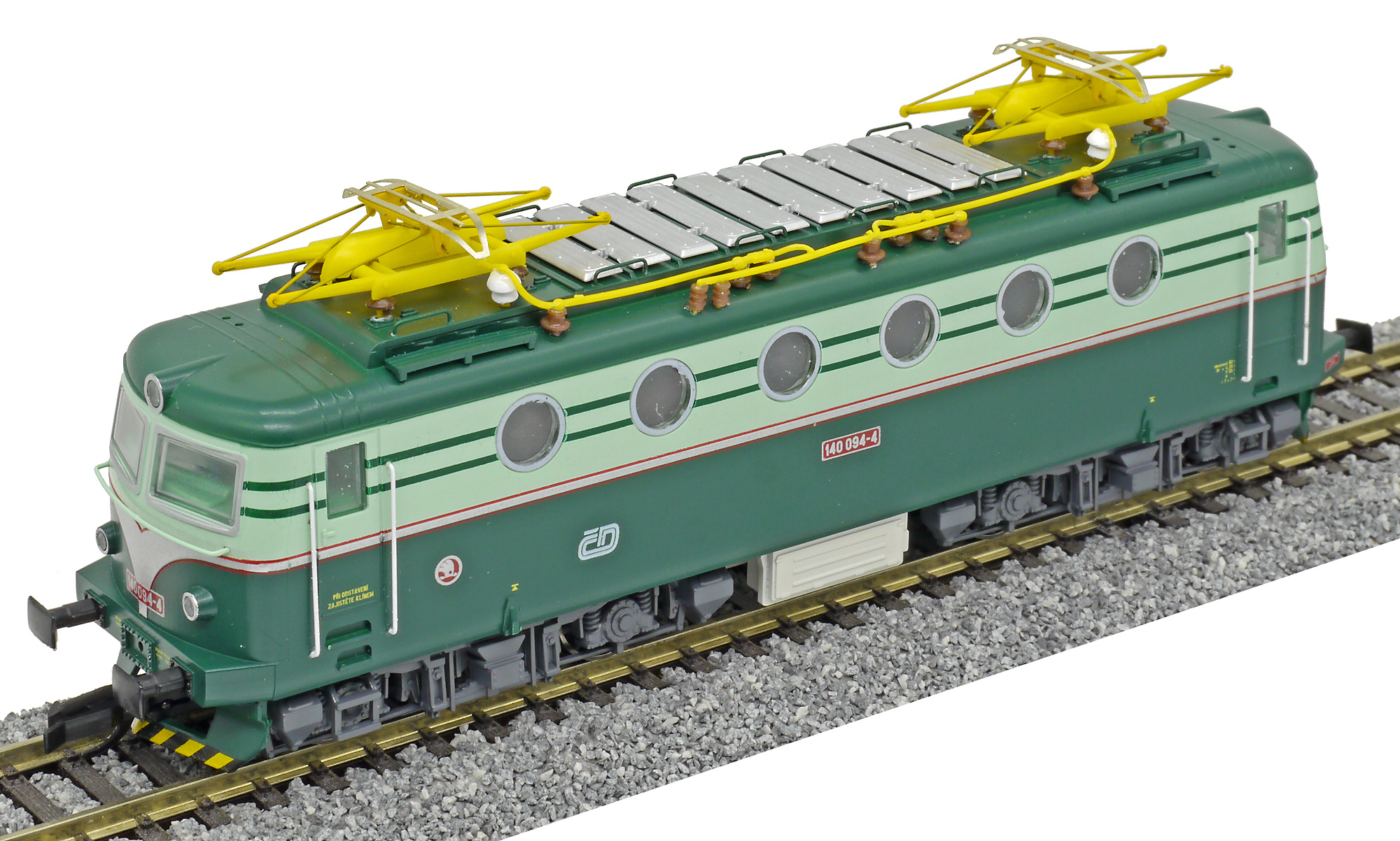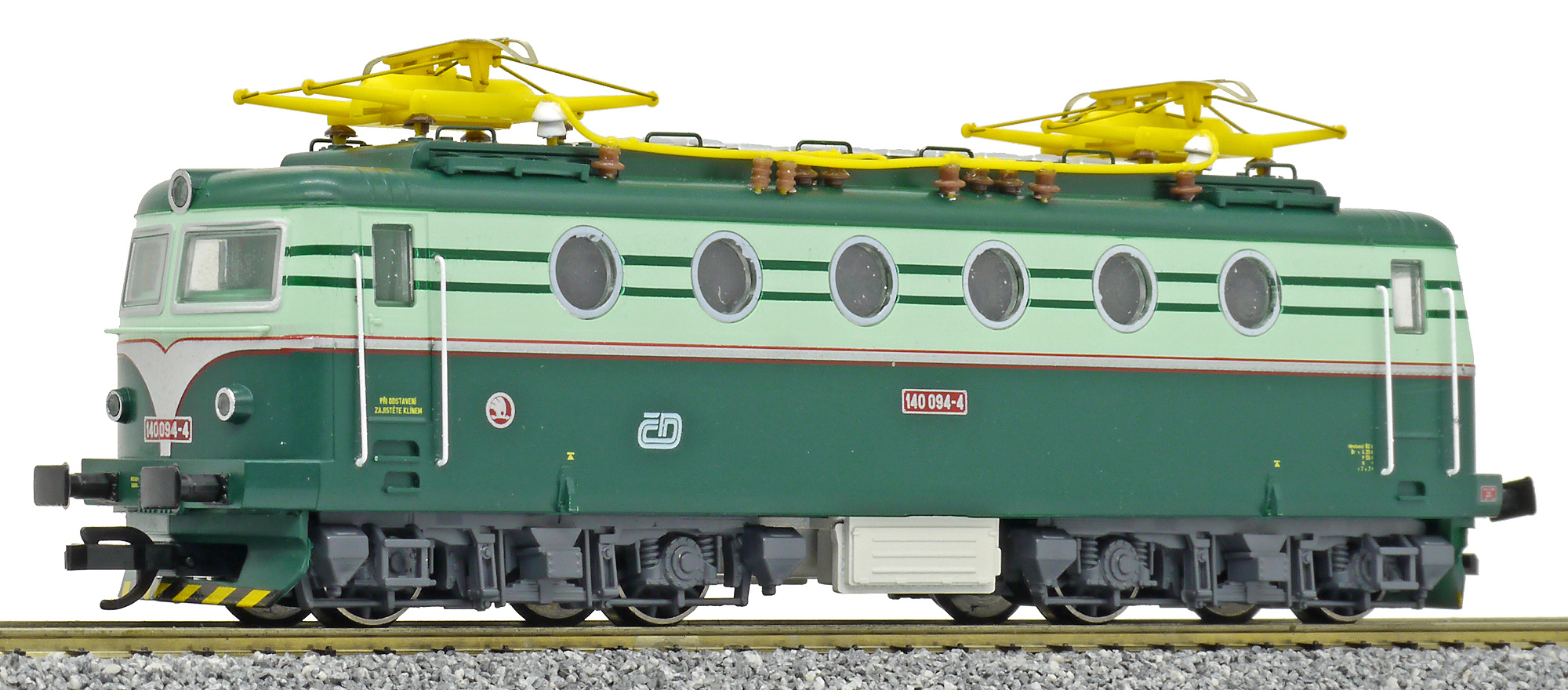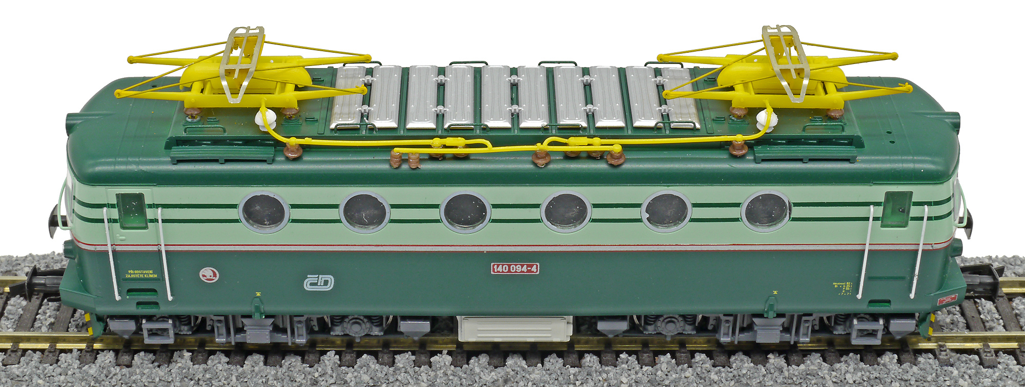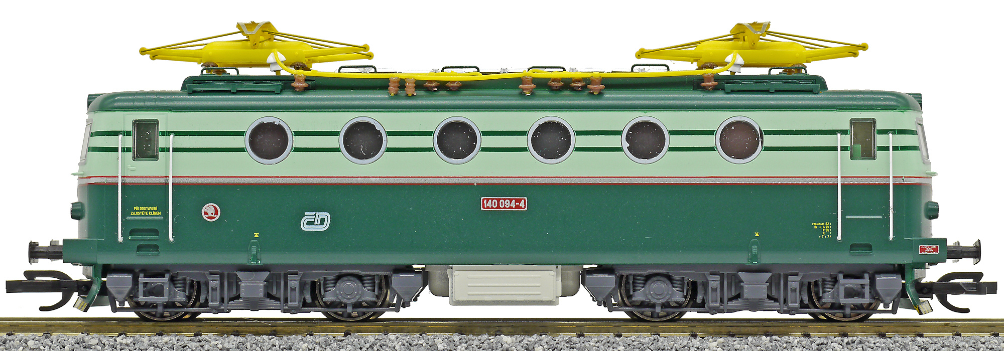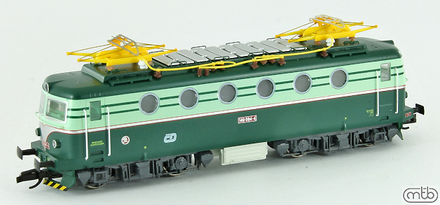 Popis   elektrická lokomotiva v nátěru tmavě zelená-světle zelená, žluté pantografy